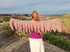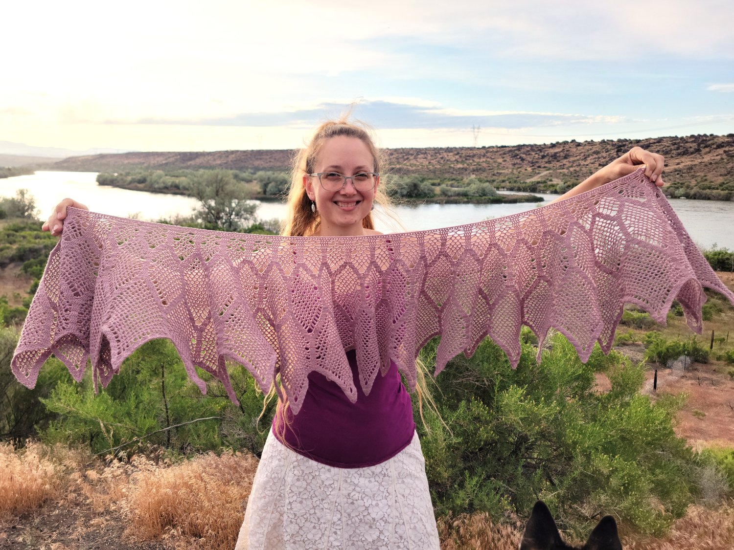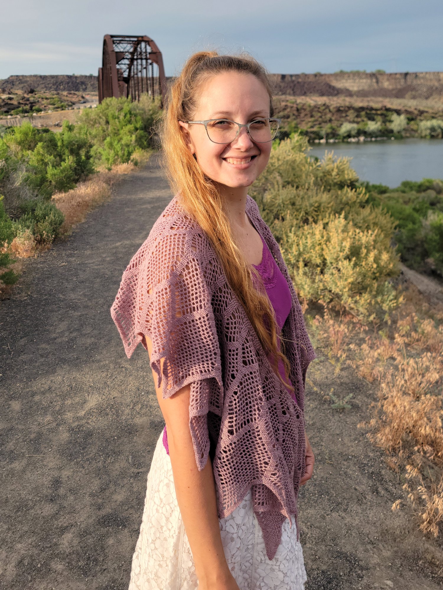 The sample shown was made with approximately 1200 yards of lace weight yarn but it can easily be adjusted to the yarn of your choice. Instructions are given on how to determine the desired number of repeats to fit your yarn.