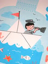 Three-color RISO print of a sailor on a boat on a bottle sailing the sea.