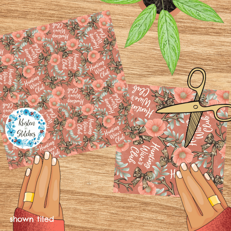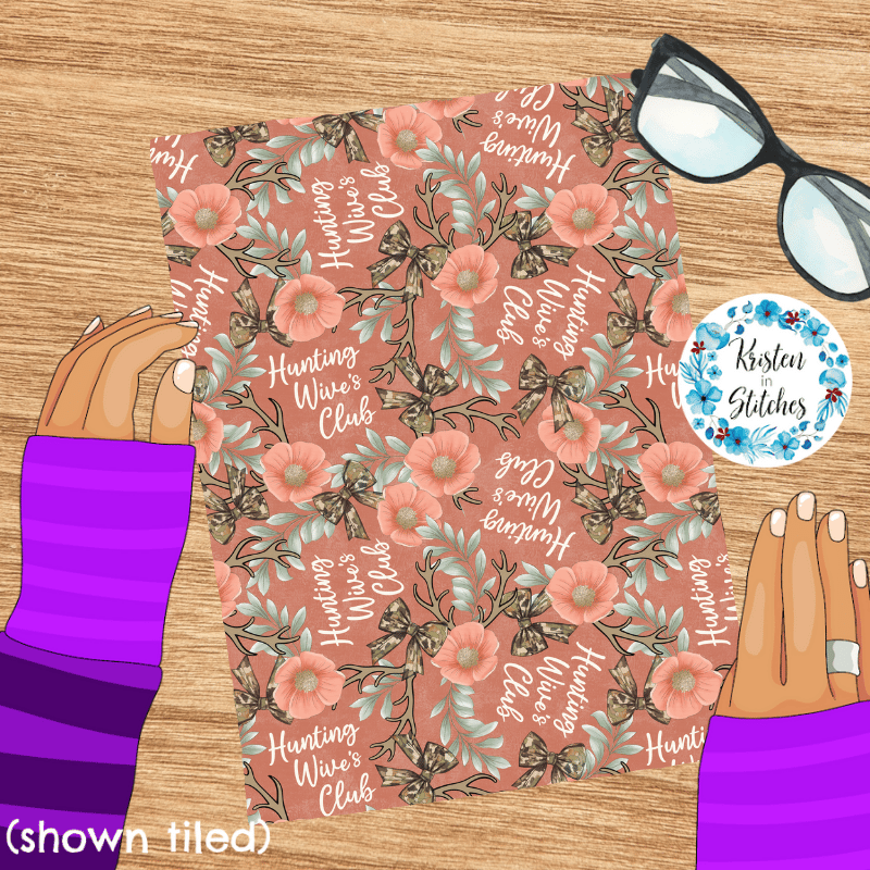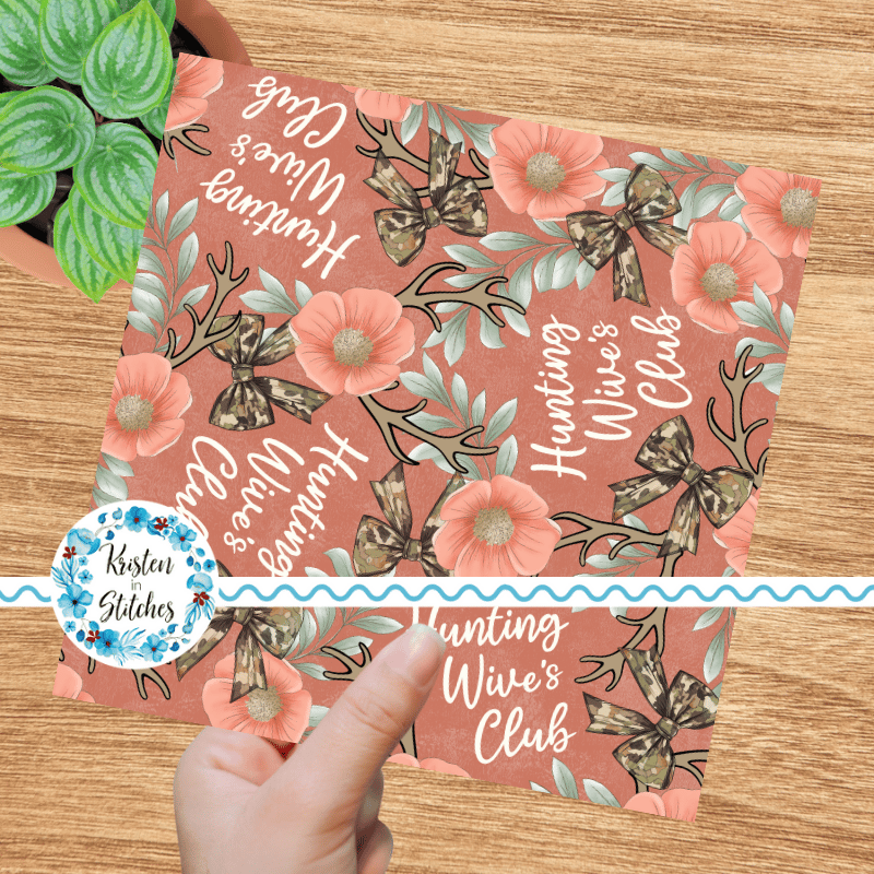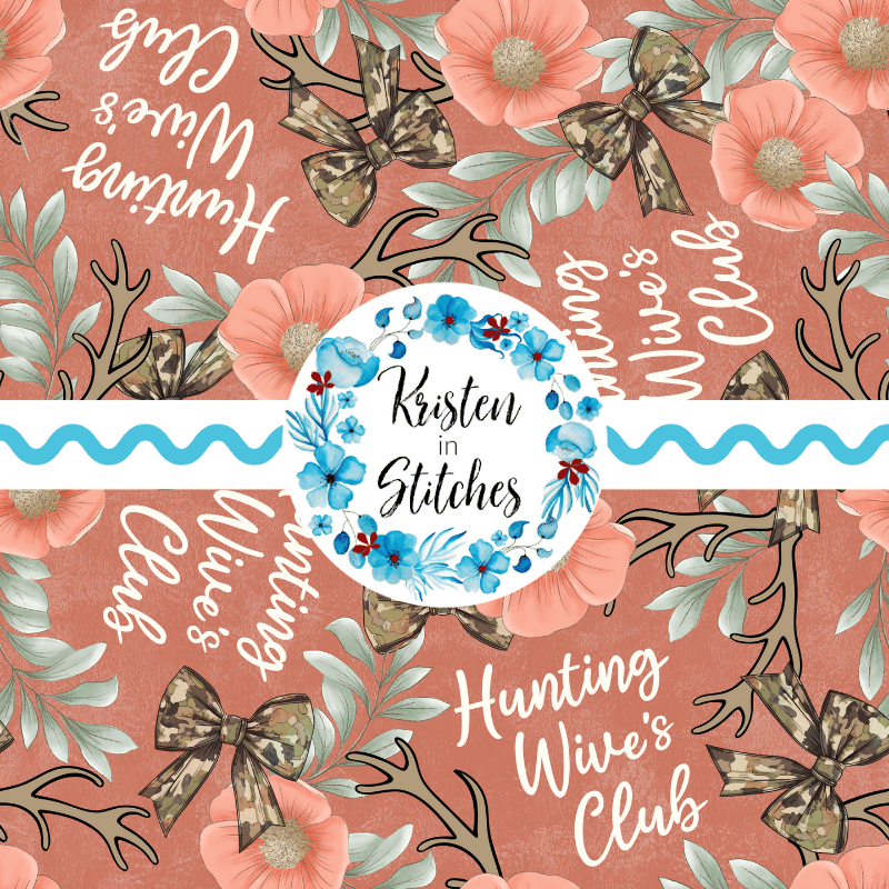 Inspired by the Hunting Wives series, featuring camo bows, deer antlers, and coral flowers on dark coral.