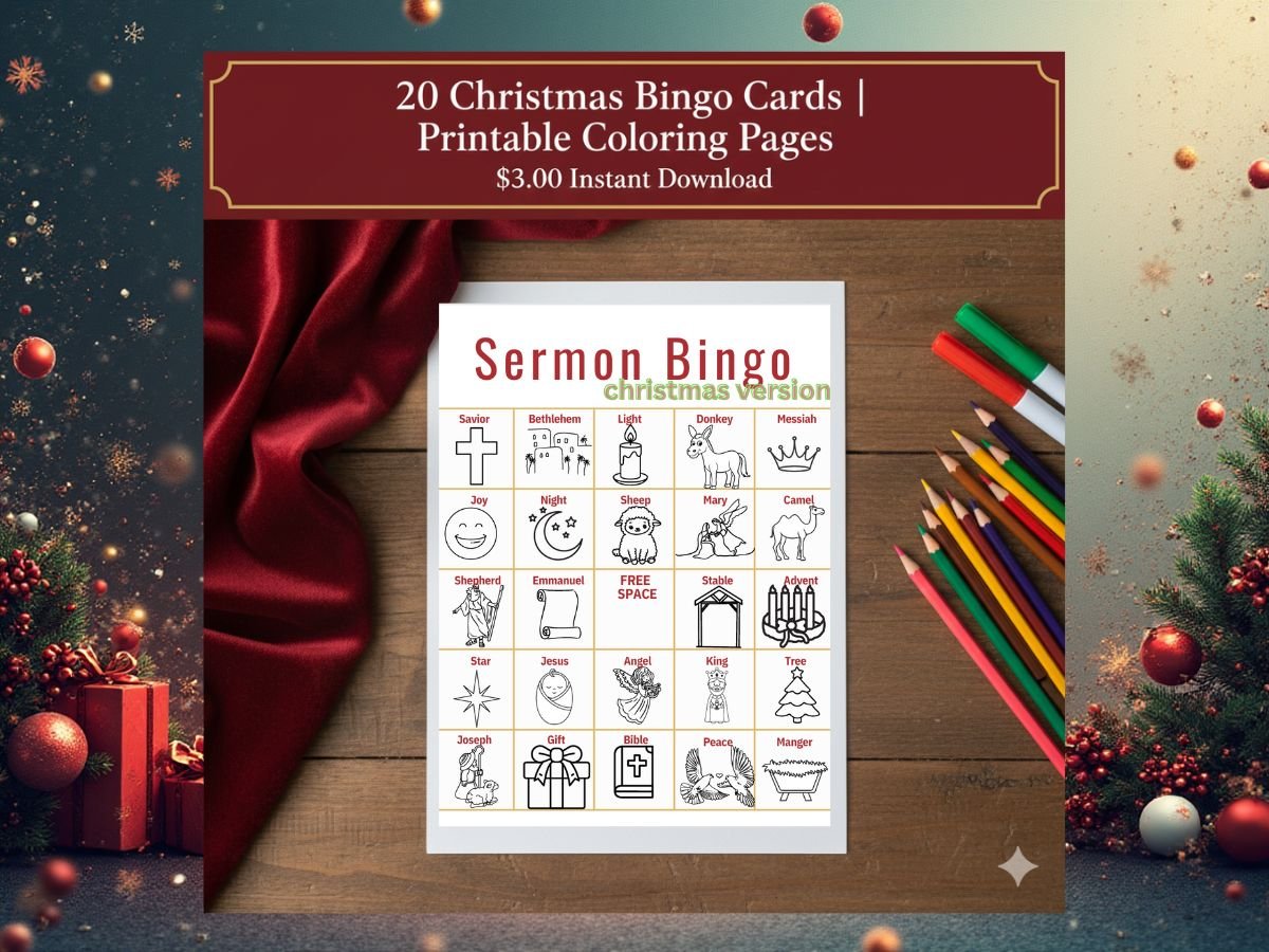 This set of 20 Christmas Sermon Bingo Cards is designed to keep young minds attentive during holiday church services. This isn't just a game—it's a fun Sunday School activity that reinforces key Nativity and Advent themes. Kids will love coloring in the beautiful black-and-white images every time the pastor says a word like Angel, Manger, Shepherd, or Advent. It’s the perfect way to bring quiet, focused engagement to your Christmas traditions.