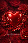 A flawless, glass-like crimson heart rests delicately within a bed of deep red roses, captured with museum-level realism and studio lighting precision.