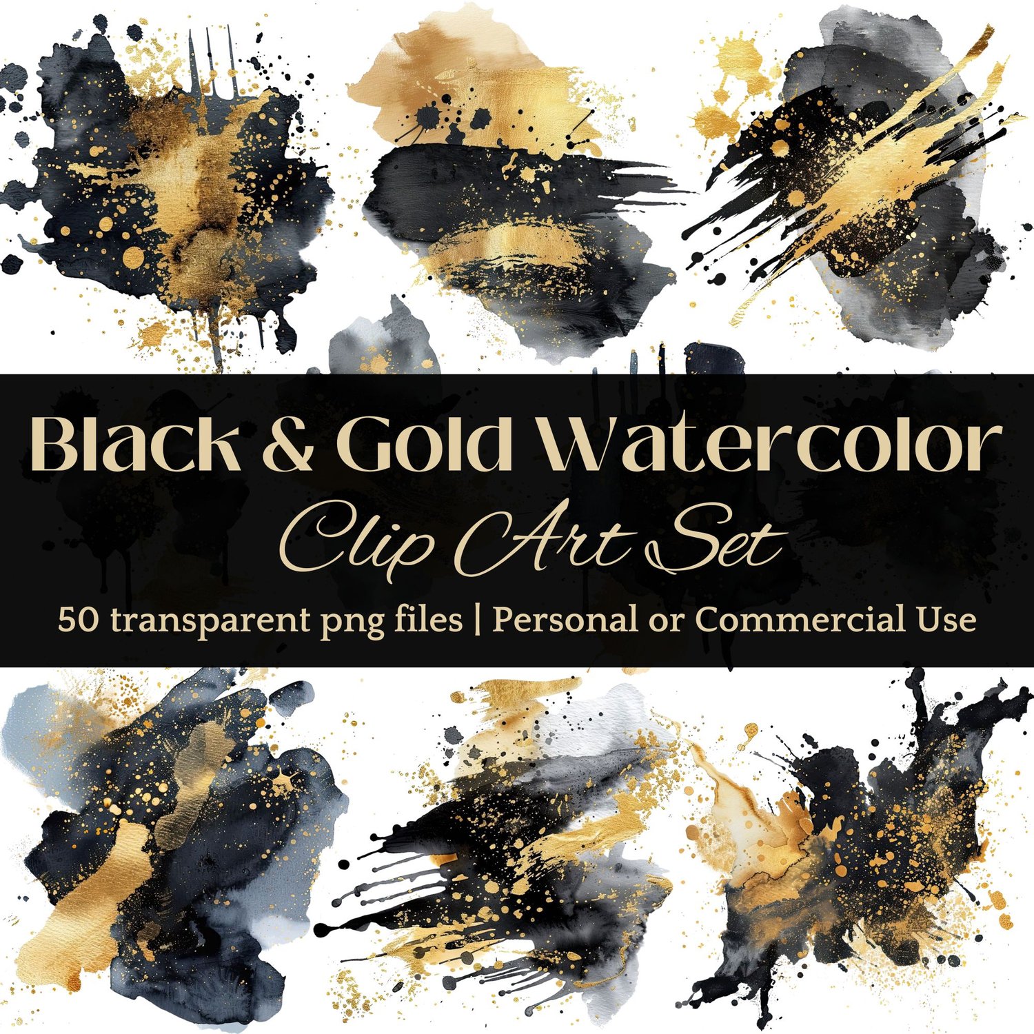 Get Creative! ✨ Let your business shine with our Watercolor Black and Gold Splashes Clip Art Set. Ideal for business owners and brands looking to infuse their products and marketing materials with a touch of elegance.