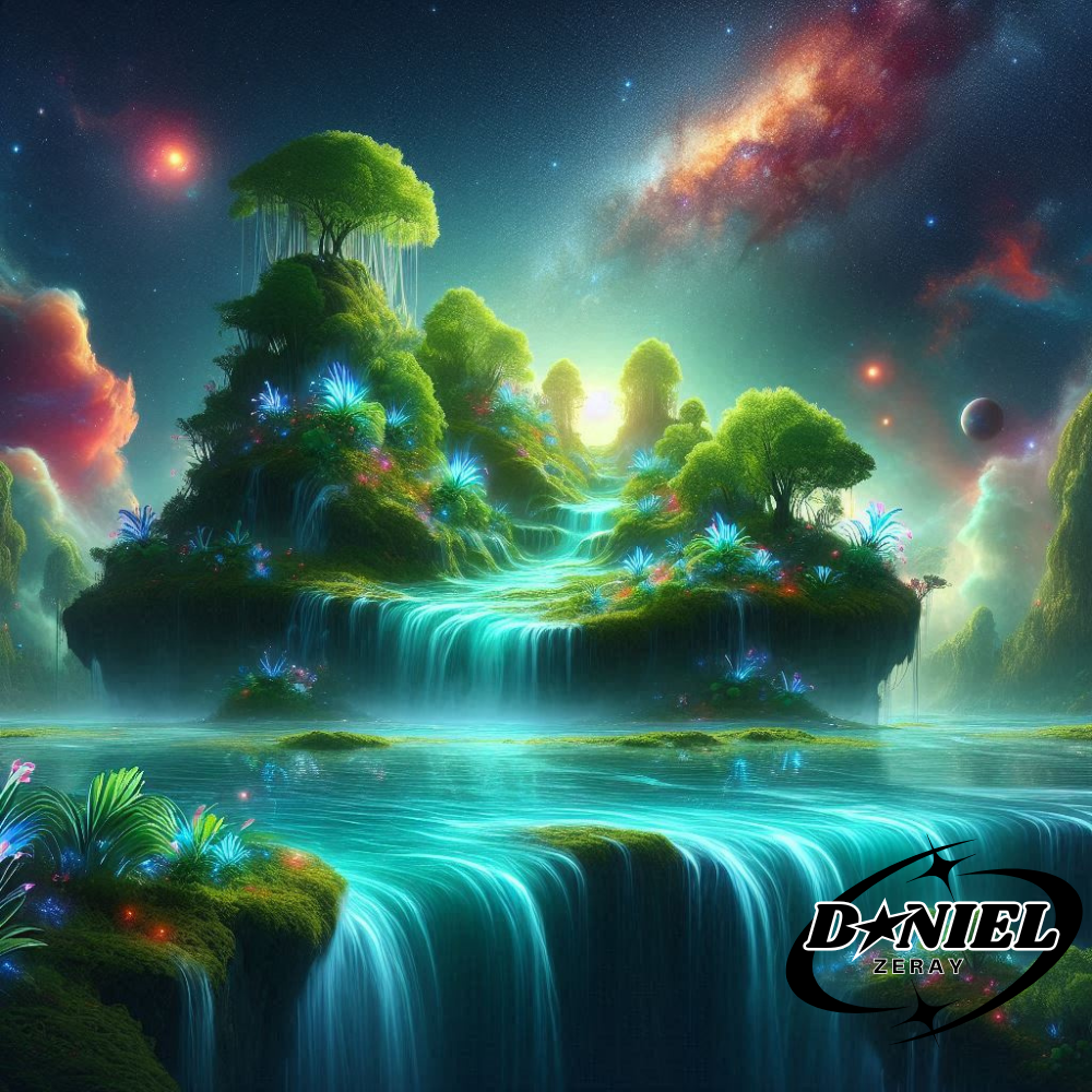 A breathtaking vision of a lush, verdant paradise suspended in the vastness of space. This floating island teems with life, its cascading waterfalls tumbling endlessly into the cosmic void below. The sky above shimmers with vibrant nebulae and radiant stars, their ethereal glow reflecting on crystal-clear pools of water. Exotic alien flora, adorned with bioluminescent petals, light up the scene with hues of electric blue, soft pink, and emerald green, creating a mesmerizing harmony of nature and the cosmos. A tranquil yet otherworldly sanctuary, where the boundaries of reality and fantasy blur."