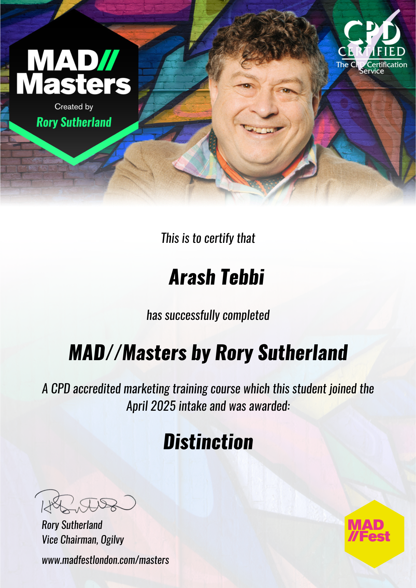 And if you've made it this far, here's a certificate indicating I received the highest degree from the master of marketing, Rory Sutherland, for my presentation about creating a marketing strategy for the healthcare networks in the UK (there's a pass, merit, and distinction scale).