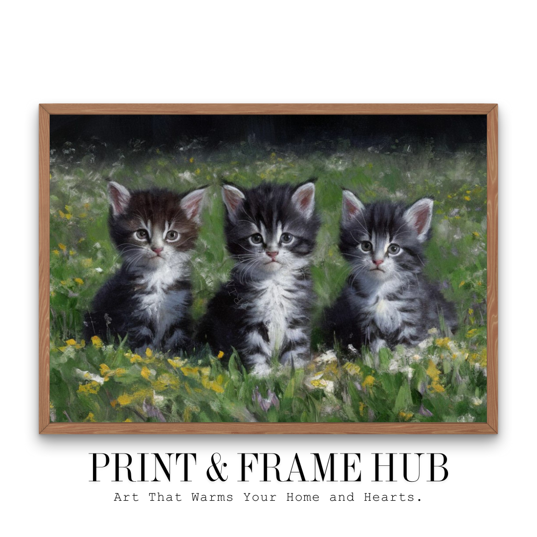 A vibrant painting featuring three kittens in a colorful meadow. The lively composition and charming subjects make this artwork an eye-catching addition, perfect for adding a cheerful touch to your home.