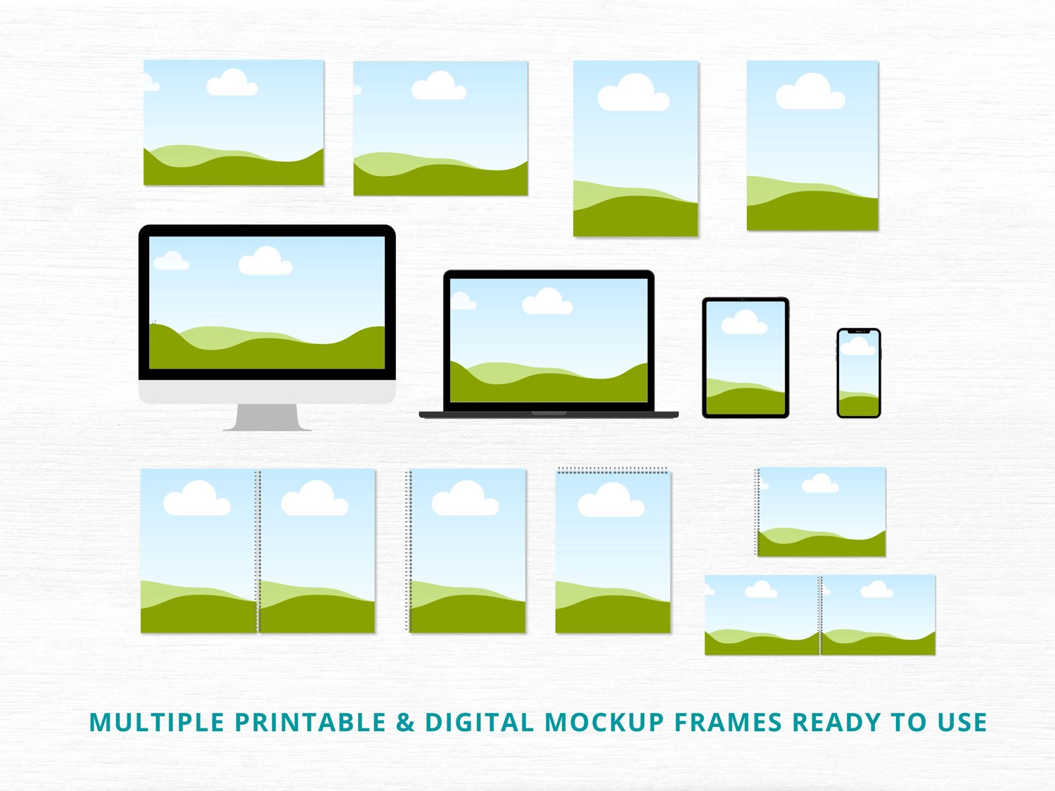 13x Paper (A4 and US Letter), bound notebook (A4 and US Letter), and digital device mock-up frames (simply drop your product image into the frame)
