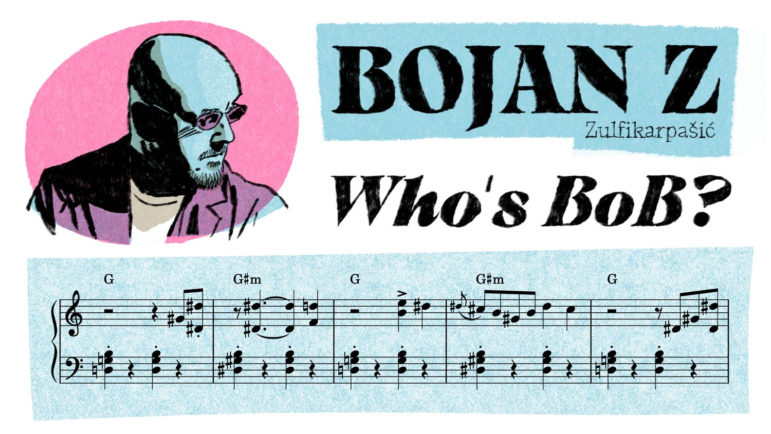 EDIT: Some commenters on my YouTube video have raised the question of the rhythm of the piece. I strongly hear the chords played in the left hand on beats 1 and 3, but it's very likely that I'm mistaken and that they're played on beats 2 and 4 (as if Bojan were playing a kind of stride without the bass). Even though I think the 2&4 version is the correct one, I can't hear it that way (let alone play it like that...).