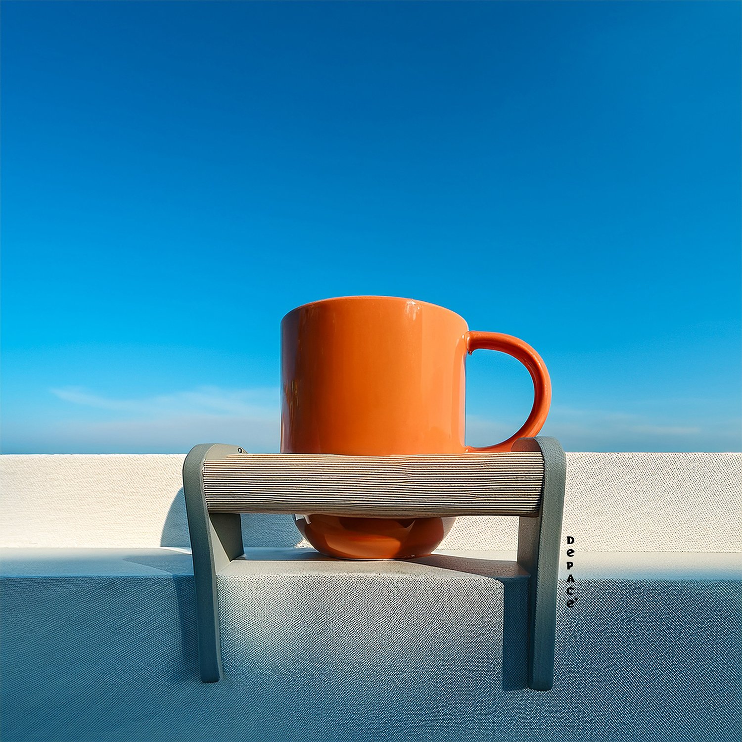 There it sits—bold, orange, and possibly forgotten. A humble coffee mug catching the midday sun like it’s on a personal vacation. Set against crisp sky blues and pale white tones, this minimalist scene feels like a still frame from a story you’re dying to finish. Ceramic texture, architectural lines, and a touch of whimsy turn the everyday into something quietly cinematic. Is it waiting for someone... or just enjoying the view?