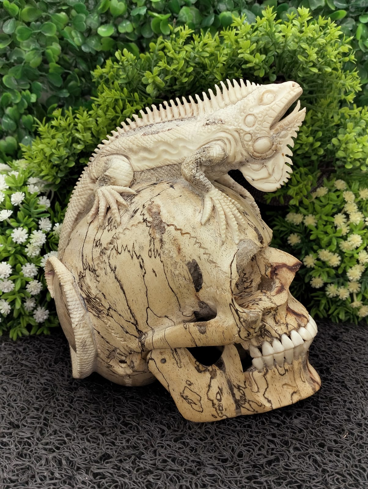 Skull and iguana carvings