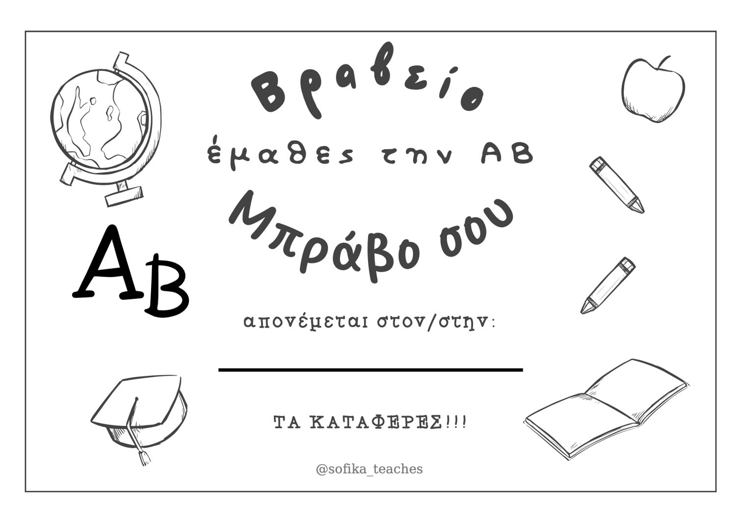 Ψάχνεις έναν όμορφο τρόπο να επιβραβεύσεις τους μαθητές σου; Αυτό το πιστοποιητικό είναι ιδανικό για να γιορτάσεις μαζί τους την κατάκτηση του αλφαβήτου! Δώσε τους την αναγνώριση που τους αξίζει και ενθάρρυνέ τους να συνεχίσουν το ταξίδι της μάθησης με χαρά.