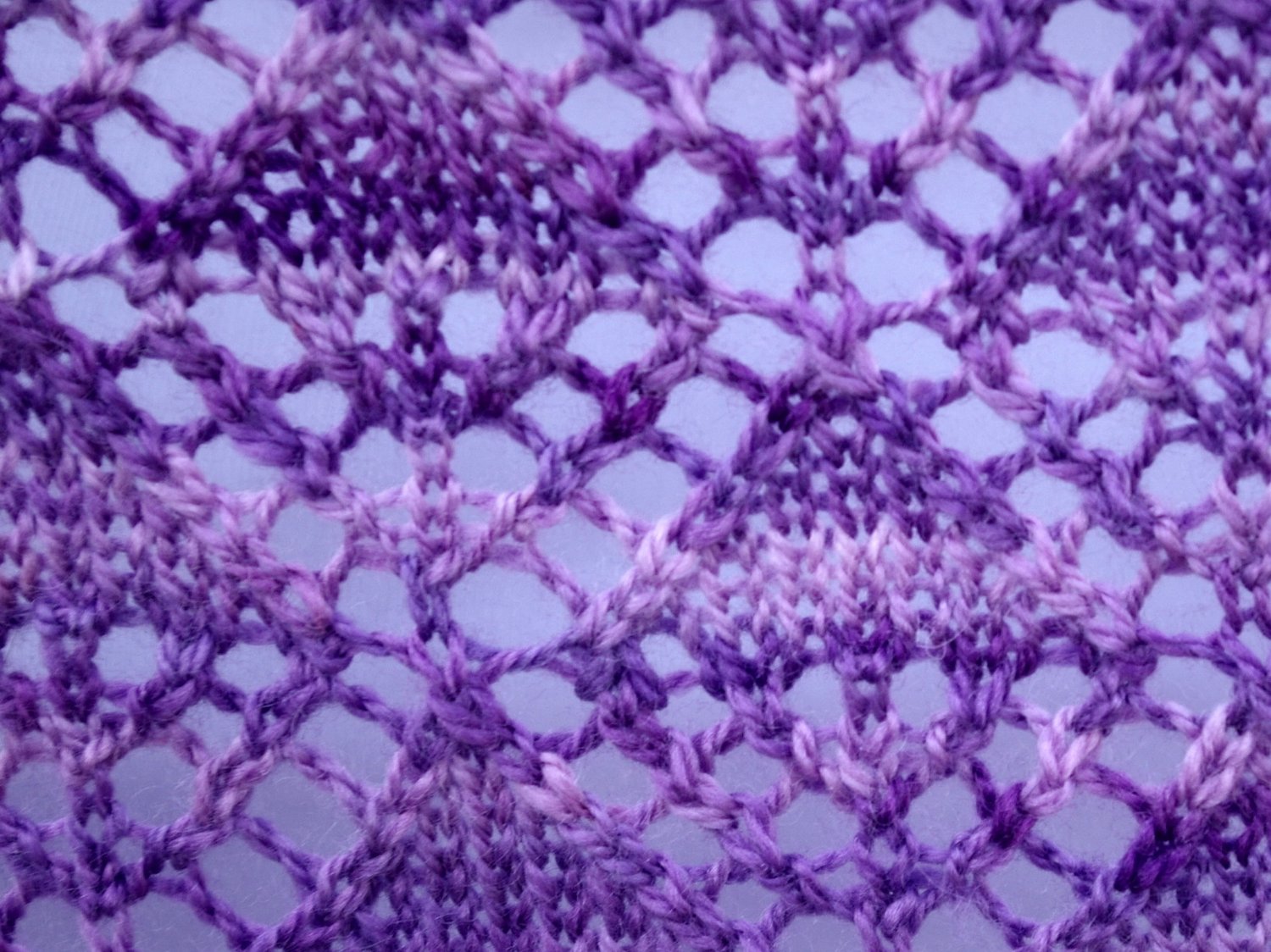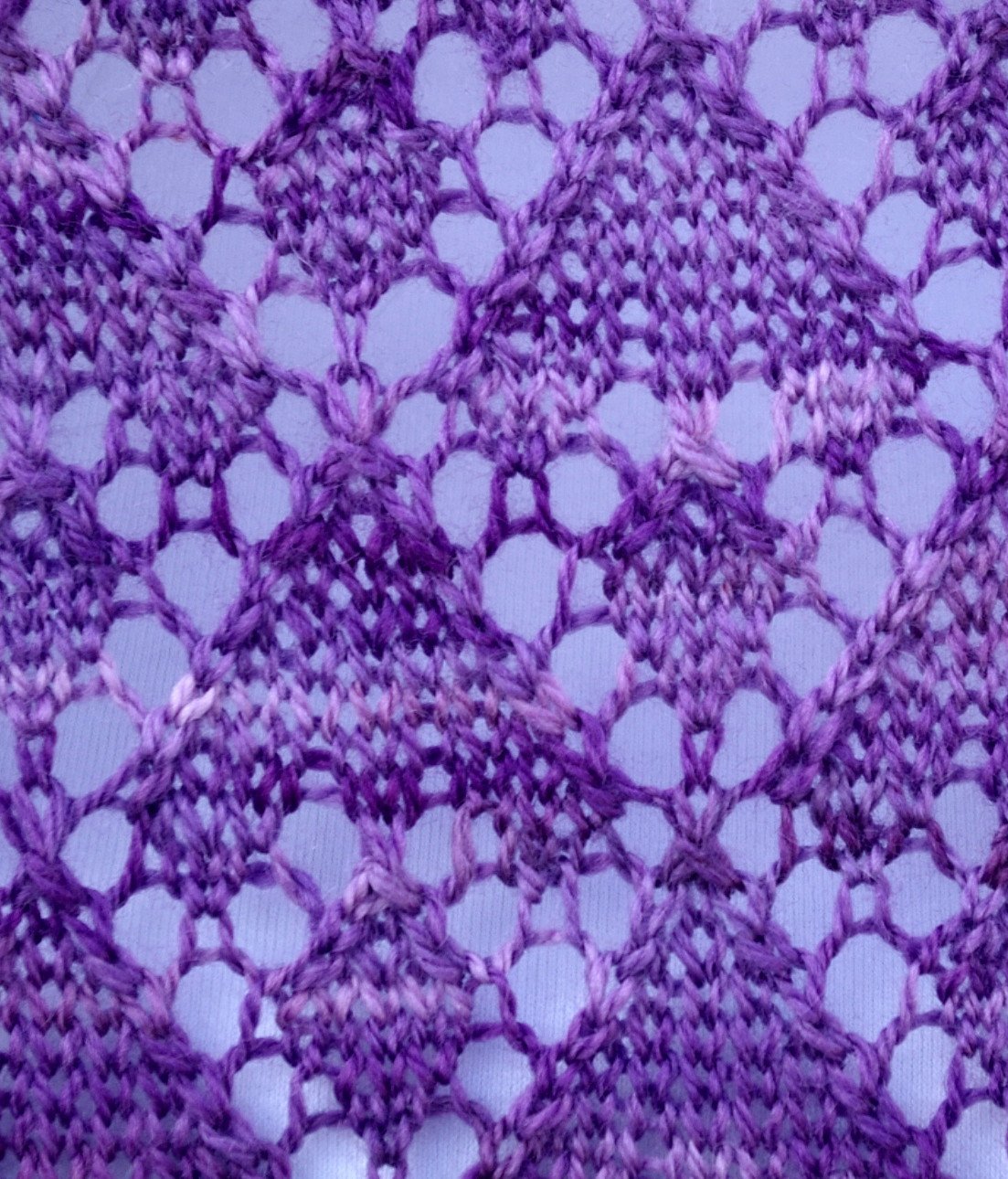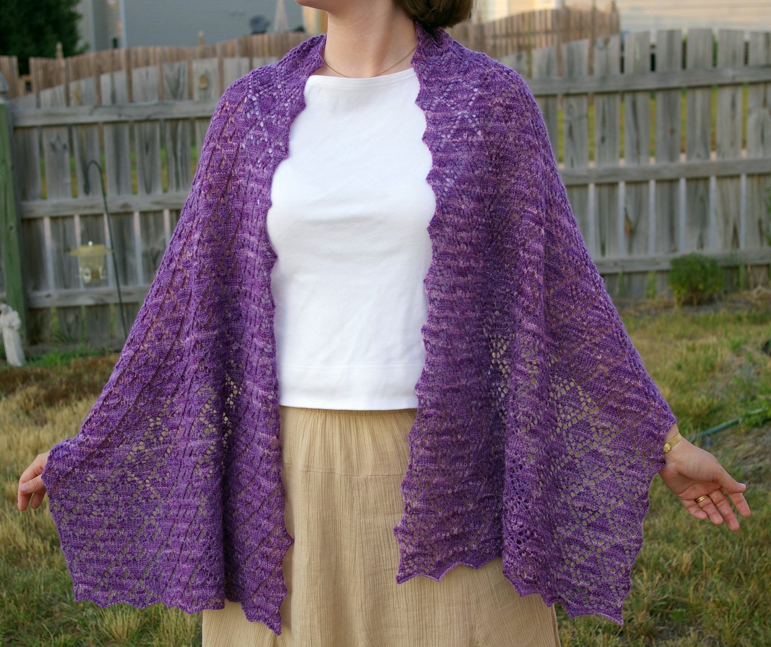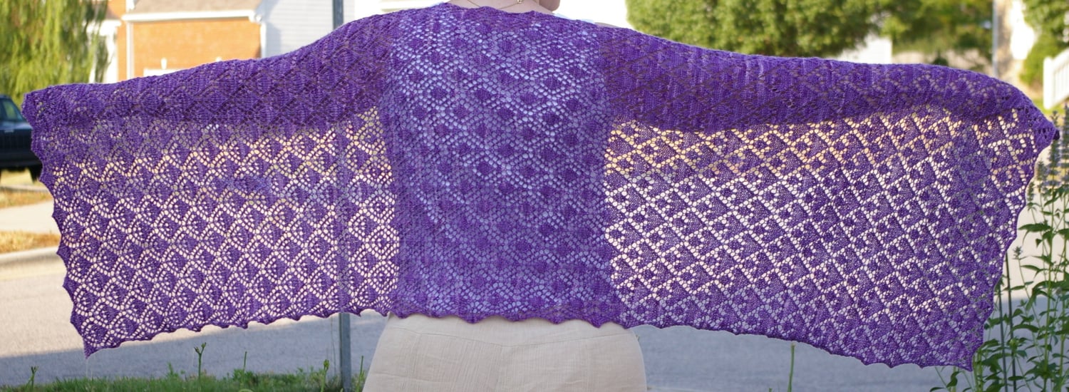 The Happy Wrap takes three different lace stitches, all based on a diamond motif, to create a flowing but nonrepetitive whole.