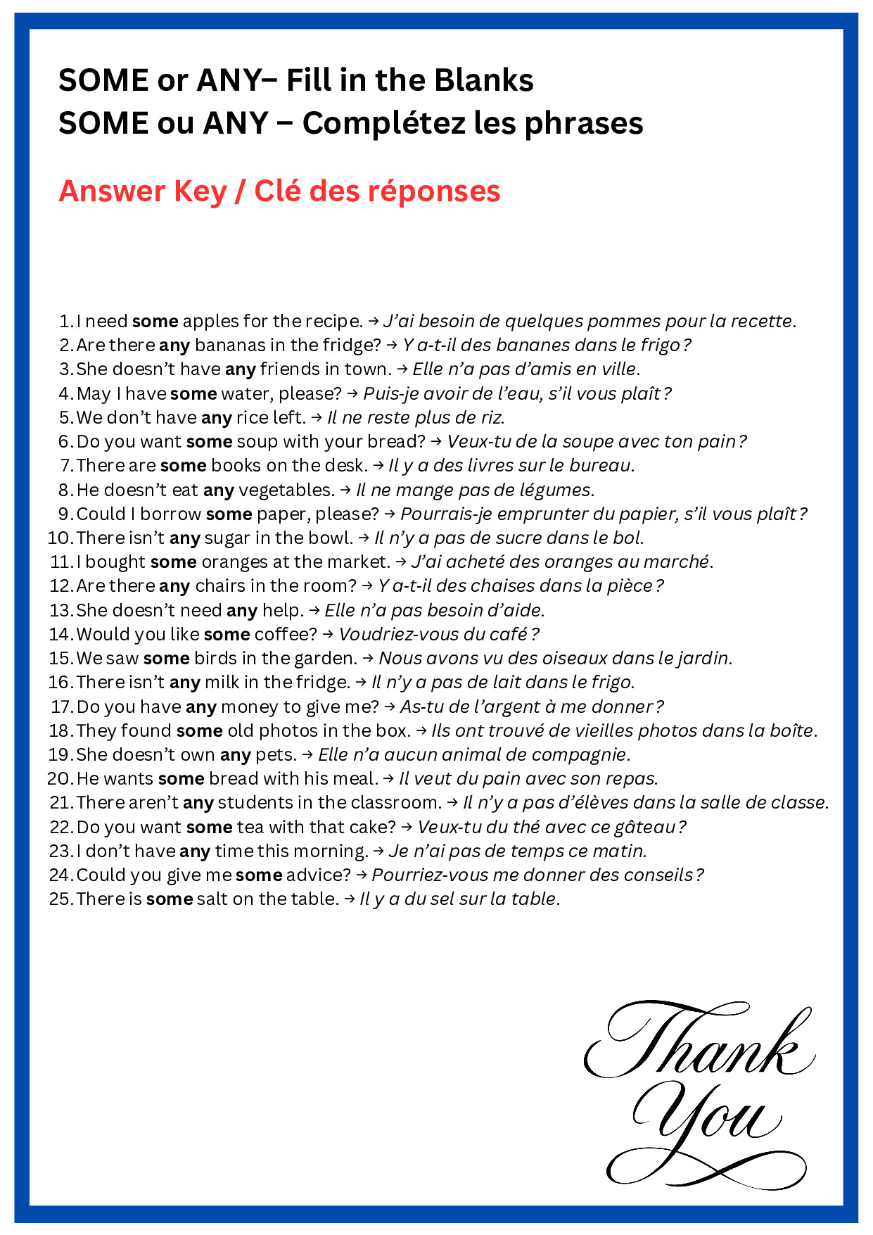 ESL Printables: 25 Sentences to Practice some / any − With French Instructions & Answer Key (Beginner A1–A2)