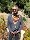 The Optimist’s Cowl is a bandana-style cowl in cheerful stripes with an i-cord tassel at the tip. It is knitted flat, then seamed.