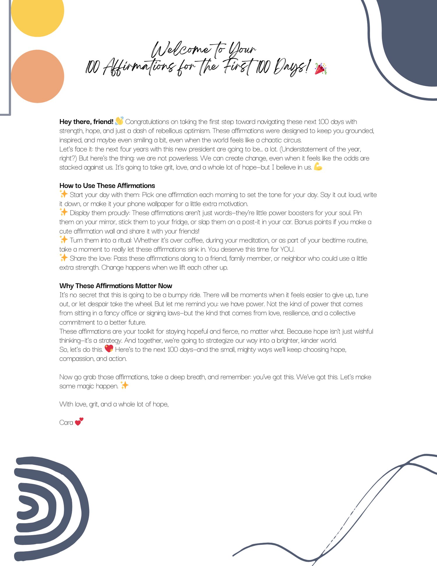 Start your next 100 days with purpose, hope, and resilience! The 100 Affirmations for the First 100 Days toolkit is packed with inspiring statements to help you stay grounded, motivated, and empowered as you navigate life's challenges.