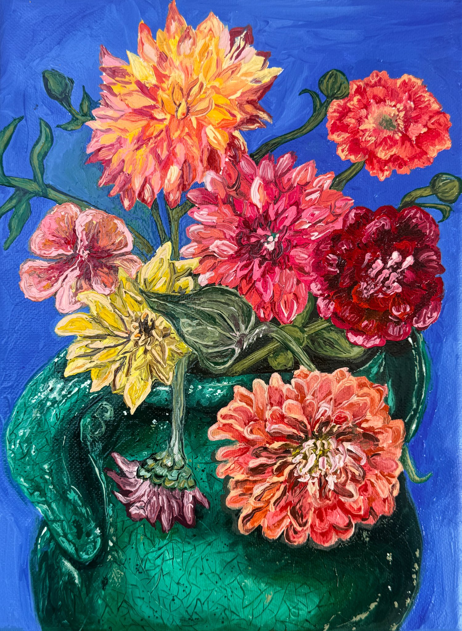 Each month I will be painting a new floral themed oil painting, just like this one I made earlier! A still life piece referenced from my own vase of dahlias , I can't wait to share my creations with you. Join the bloom <3