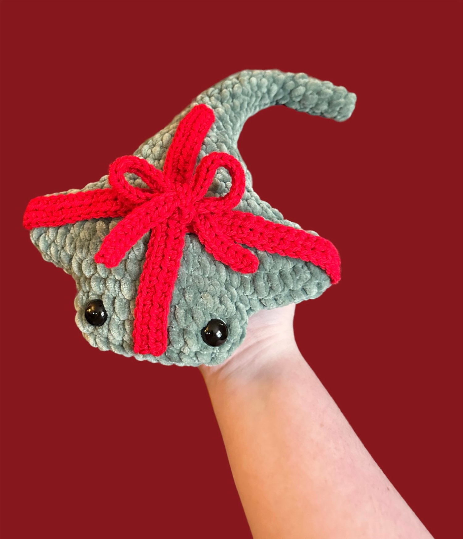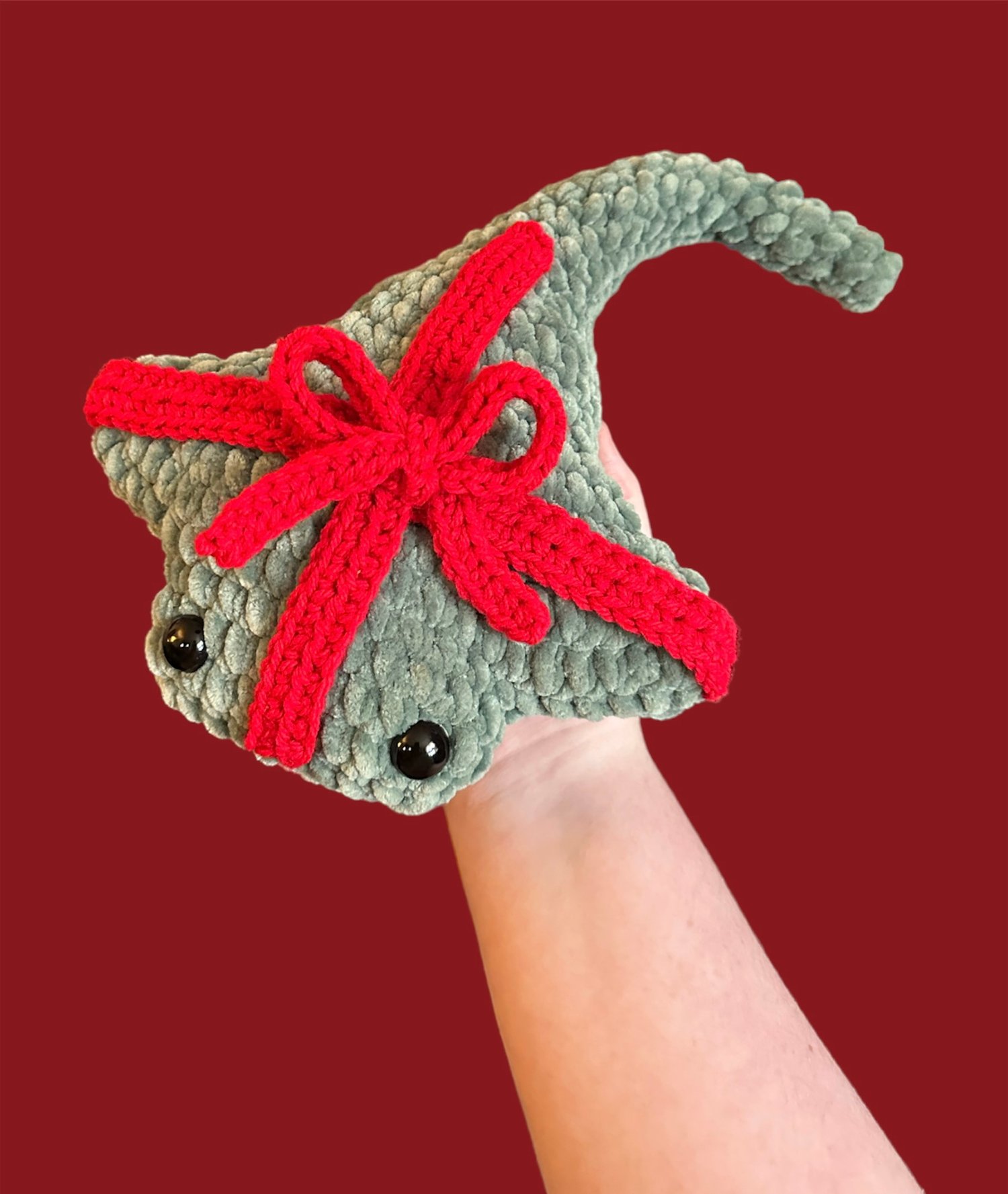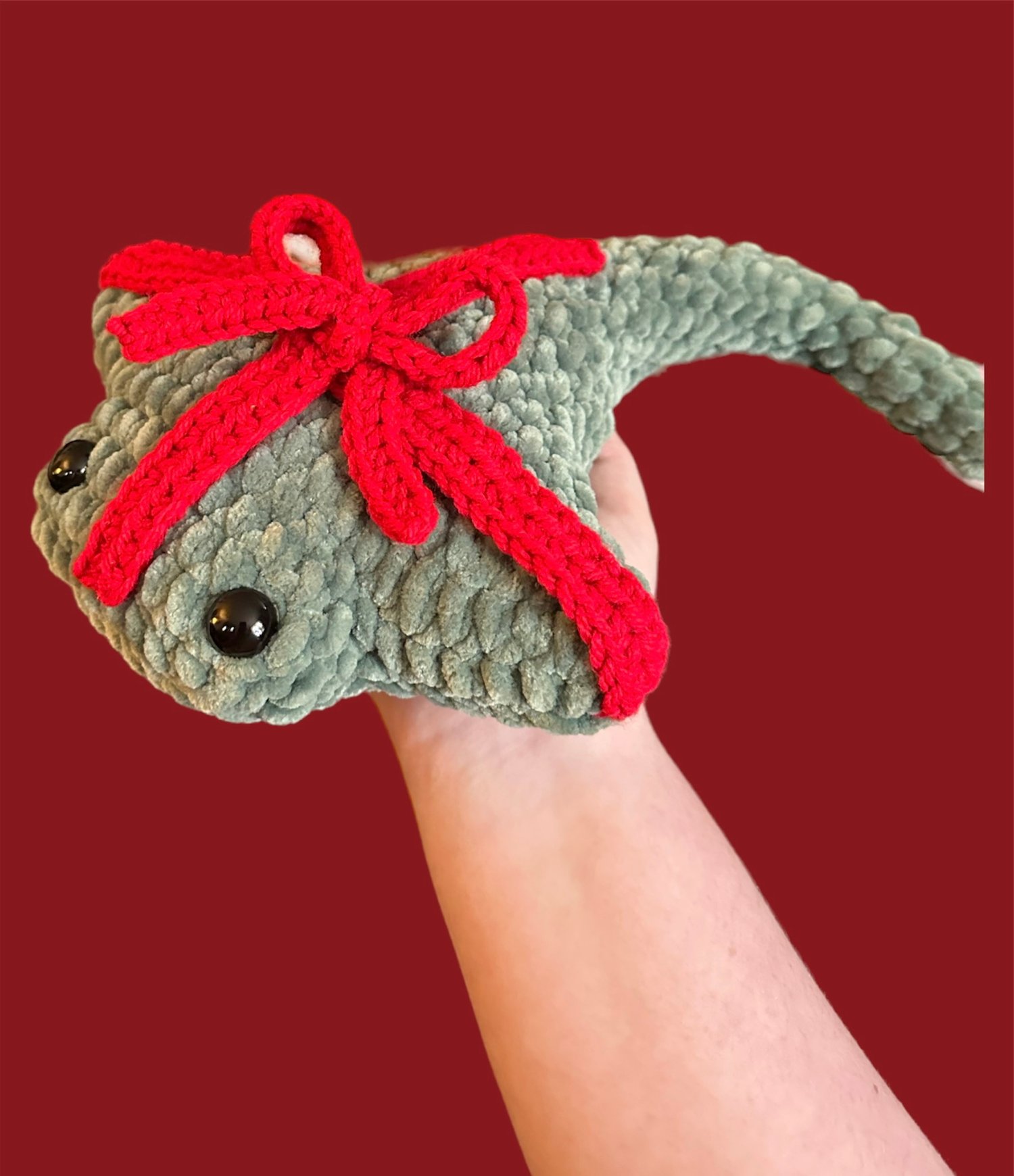 Green stingray made with soft chenille yarn and a red “gift wrap” ribbon. These colors were made as a Christmas stingray however this item is customizable, if you’d like different colors please email me at chronicallyabby@gmail.com