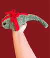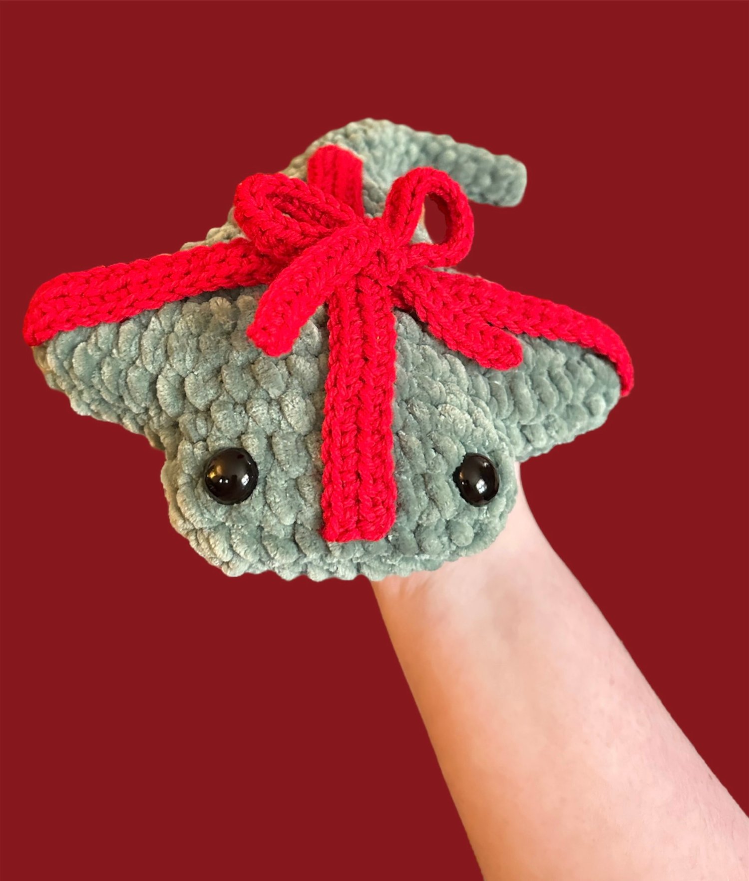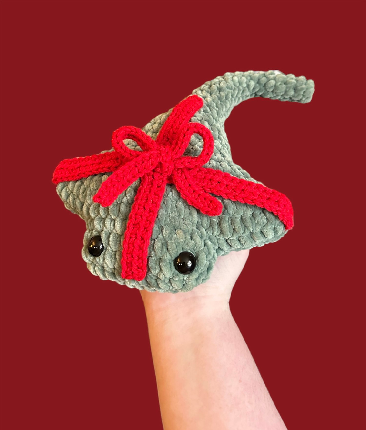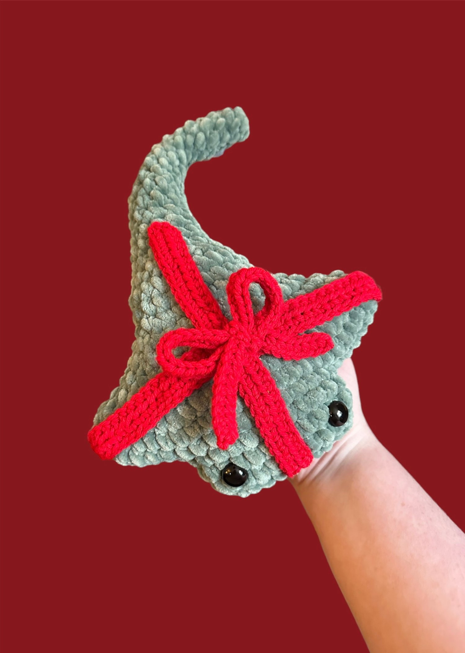 Green stingray made with soft chenille yarn and a red “gift wrap” ribbon. These colors were made as a Christmas stingray however this item is customizable, if you’d like different colors please email me at chronicallyabby@gmail.com