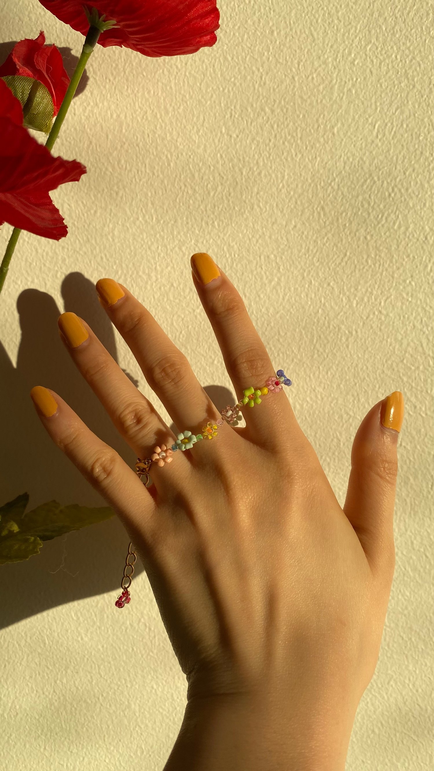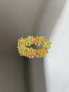 A playful trio of tiny flowers in green, orange, and yellow – like a mini summer garden for your finger. Bright, fun, and handmade to make you smile.