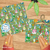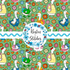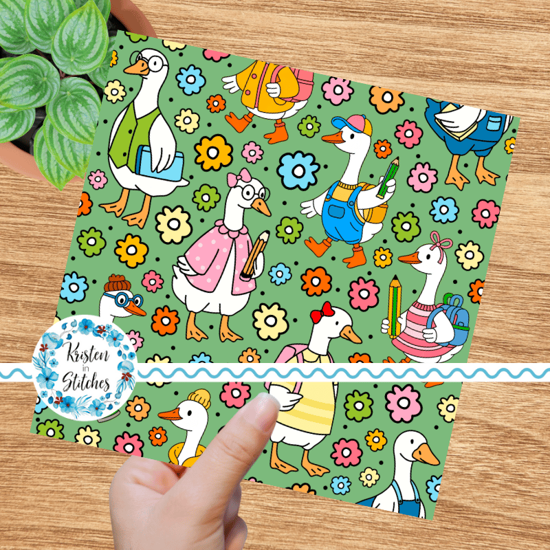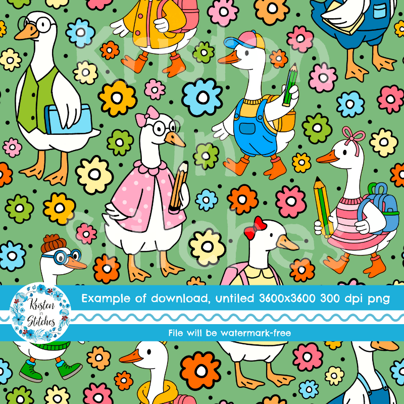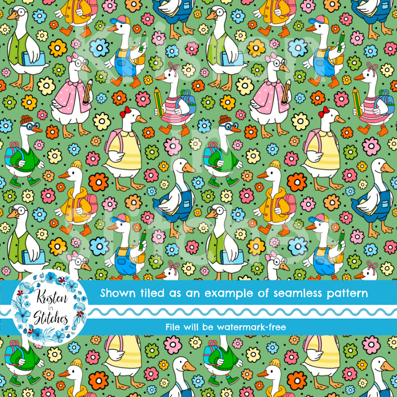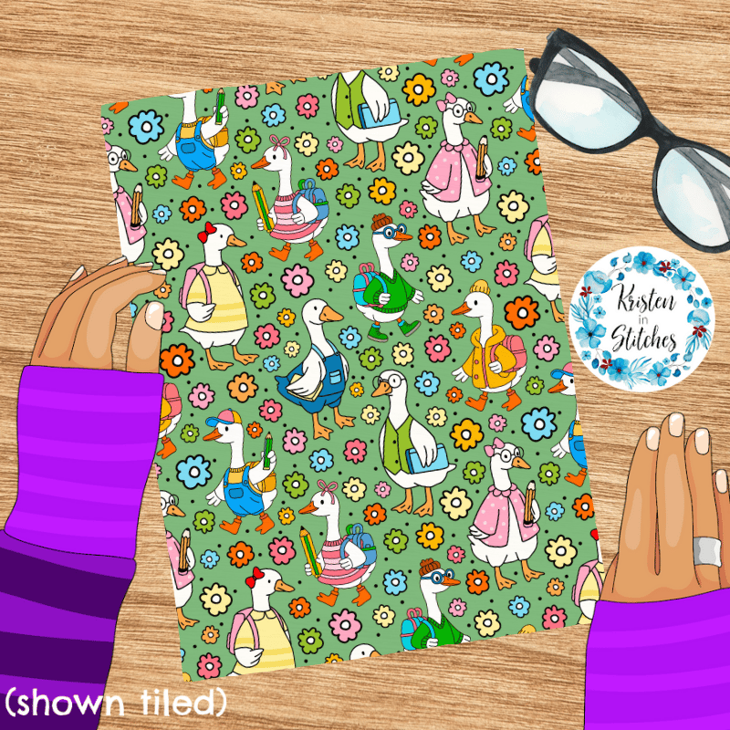 Cute geese are ready for their school days. A cute pattern for an elementary school teacher or librarian on green.