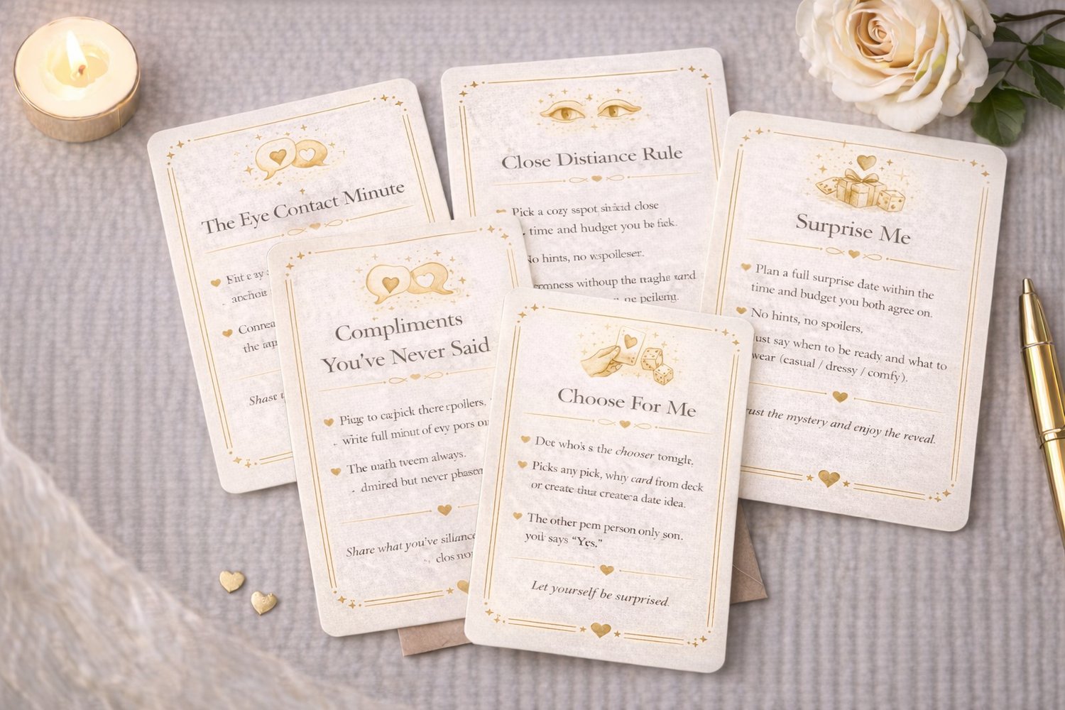 romantic prompts, and easy-to-print activities designed to spark deeper connection, at home, outdoors, or long distance. Perfect for Valentine’s Day gifts, anniversaries, and thoughtful nights in. Instant download, print-ready (A6), beautifully designed, and effortless to use, shuffle, draw, and enjoy.