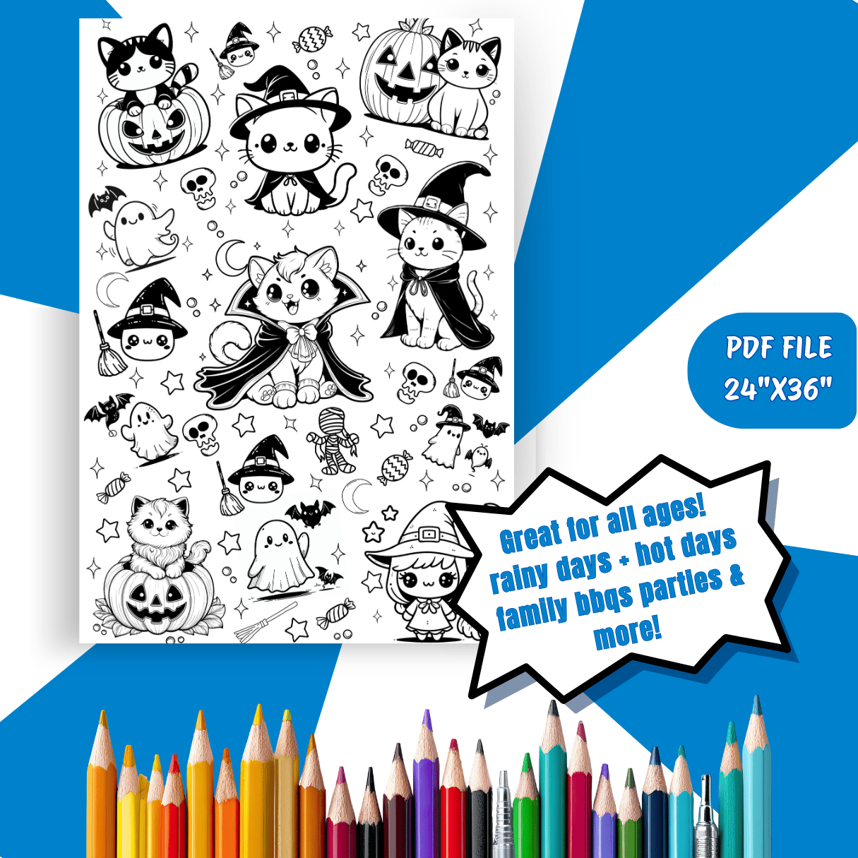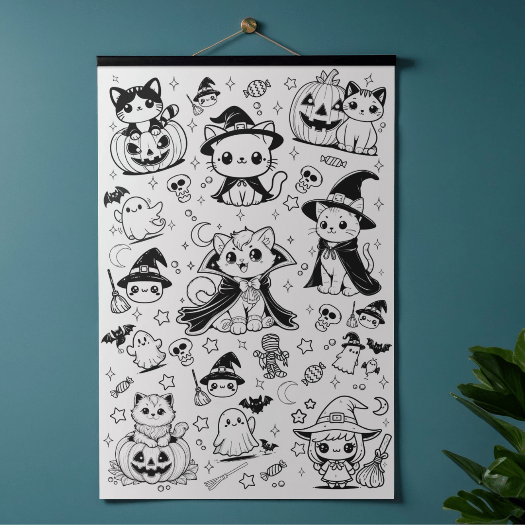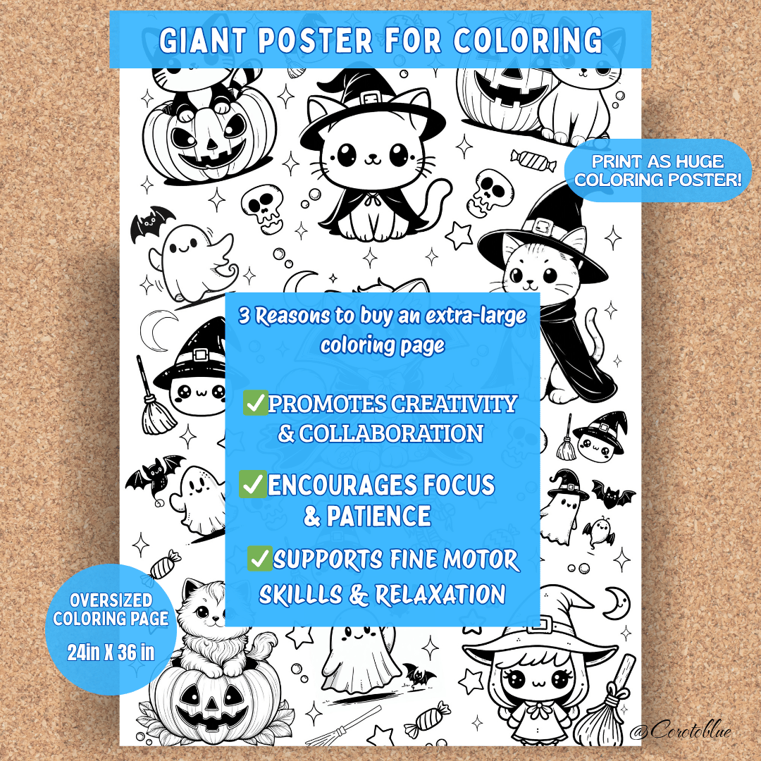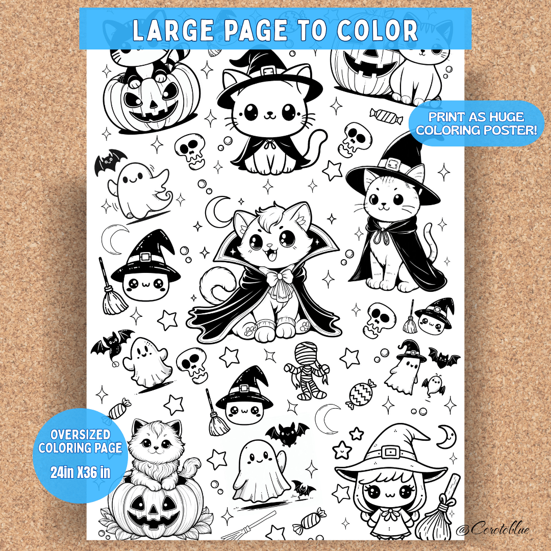 Transform your Halloween celebration with this giant Halloween coloring poster, which serves as festive wall decoration and as a fun activity for classrooms or gatherings. With adorable characters, this giant banner is a fun activity for the whole family.