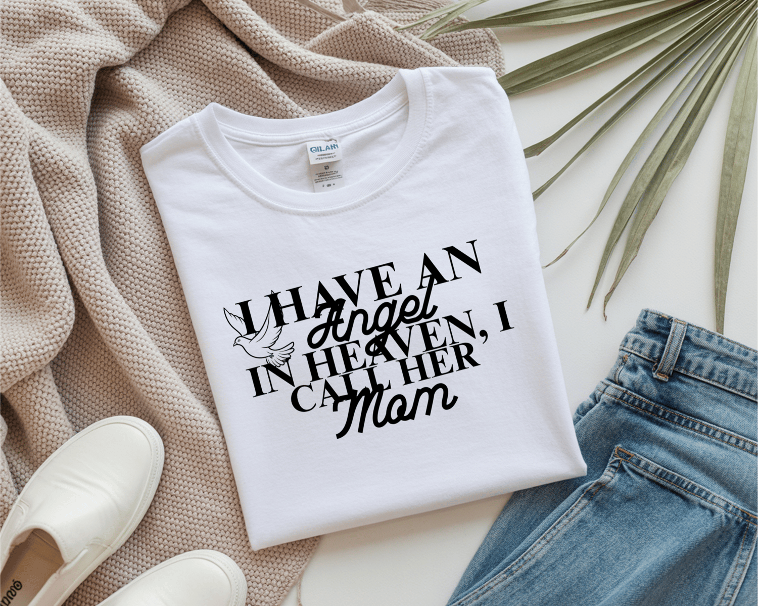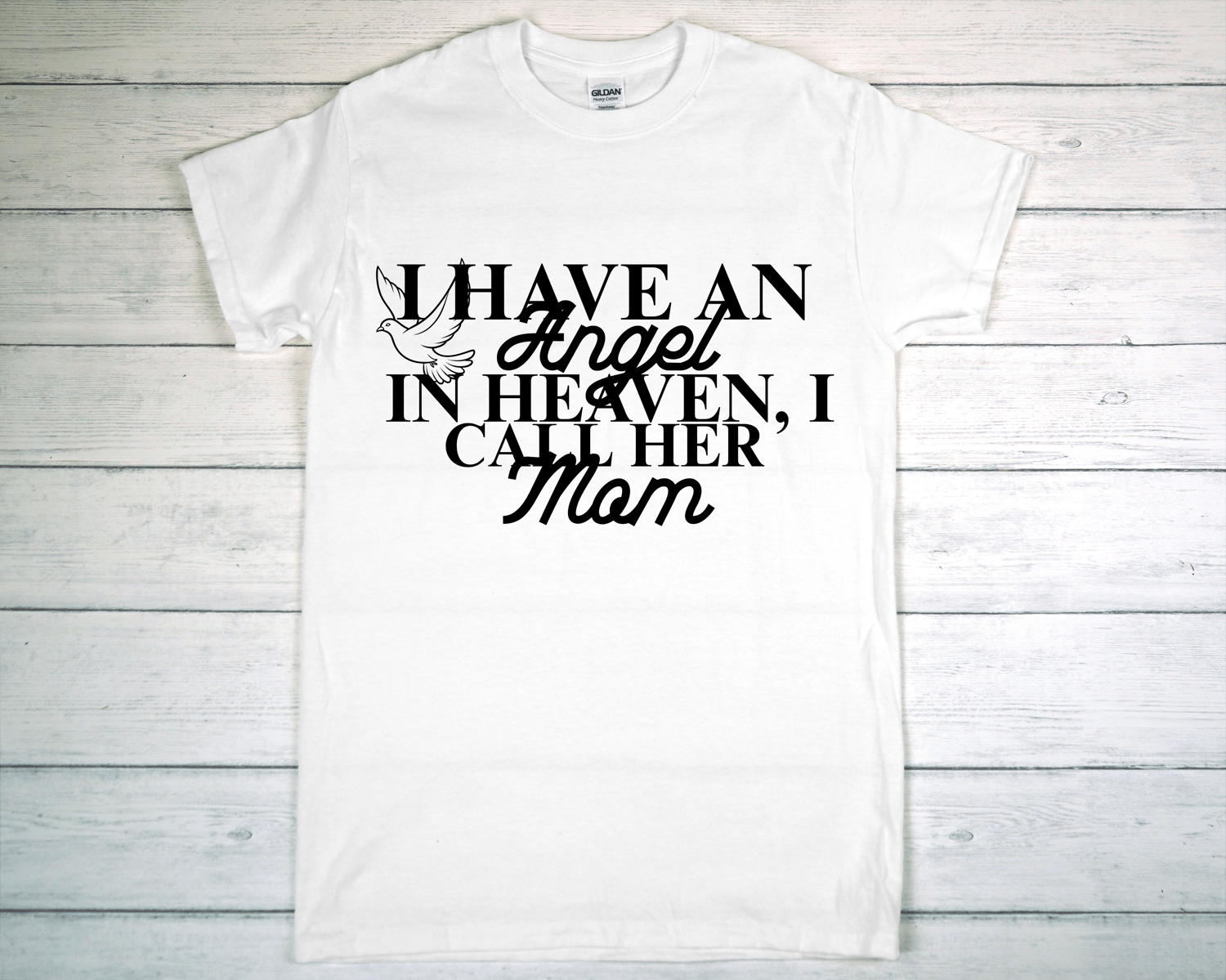 Honor the memory of a loved one with this beautiful Gildan brand memorial T-shirt. Featuring the heartfelt message “I Have an Angel in Heaven, I Call Her Mom” in bold, lasting print.