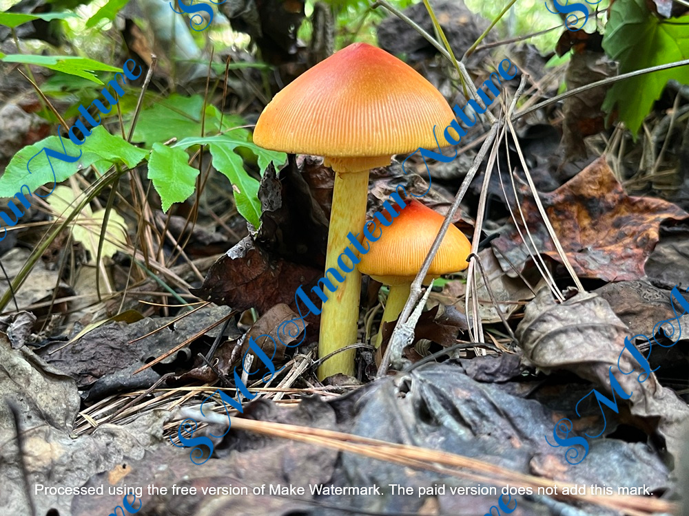 Amateur photograph of a couple of Jackson's Slender Caesar Mushrooms (Amanita jacksonii) growing in a forest. Image taken in Virginia, USA. Image pixels 3024x4032. Image easily resized as required for buyer needs. Purchase gives image without any watermark.