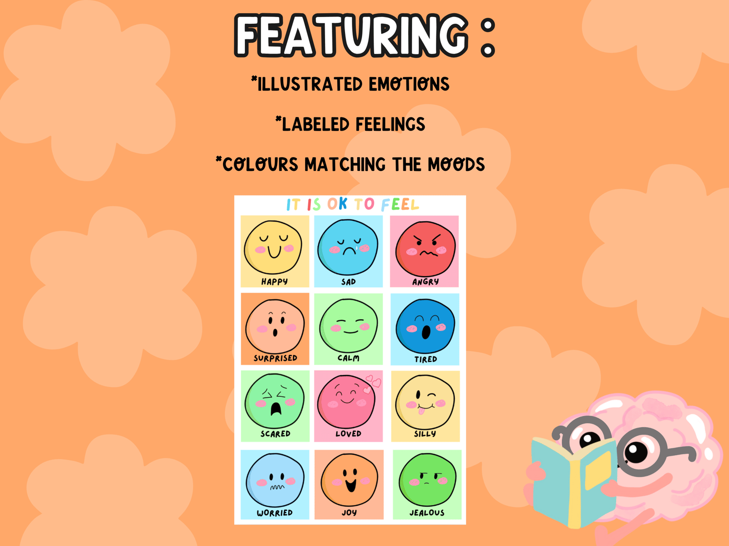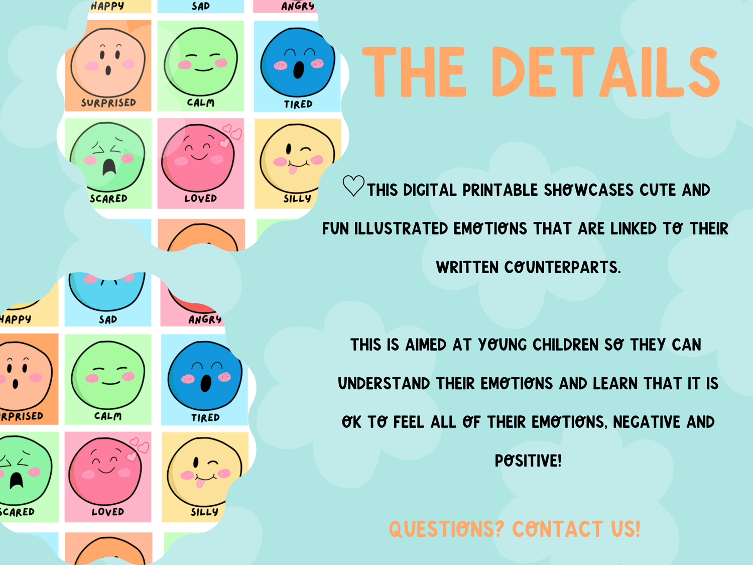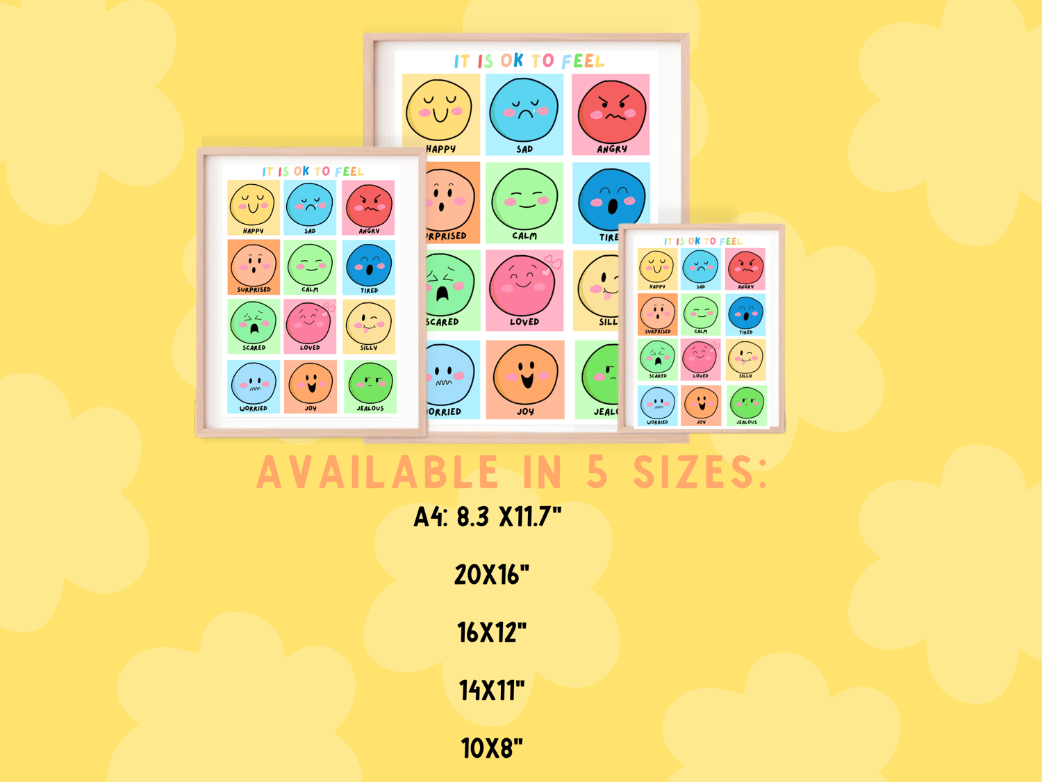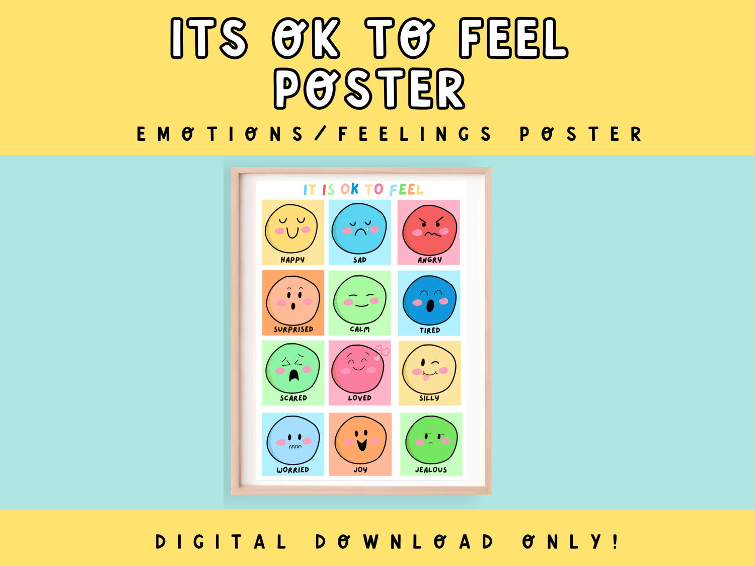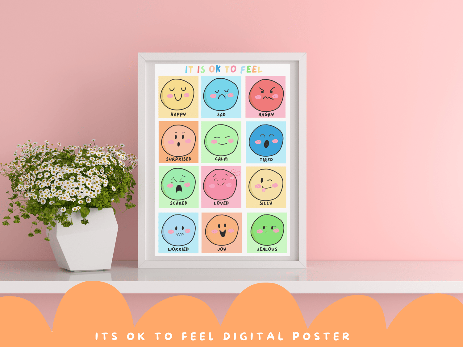 IT IS OK TO FEEL digital printable : Help children understand their emotions with this beautifully designed "It's OK to Feel" digital printable poster! Featuring a vibrant and engaging layout and fun illustrated emotions. This educational wall art encourages emotional awareness and can help with healthy conversations about feelings. Perfect for classrooms, playrooms, therapy offices, or bedrooms, this poster is a thoughtful tool for teaching kids that ALL emotions are valid.