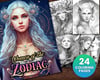 24 Women of the Zodiac Signs Fantasy Anime Coloring Page, Adults + kids- Download - Grayscale Coloring Page - Gift, Printable PDF