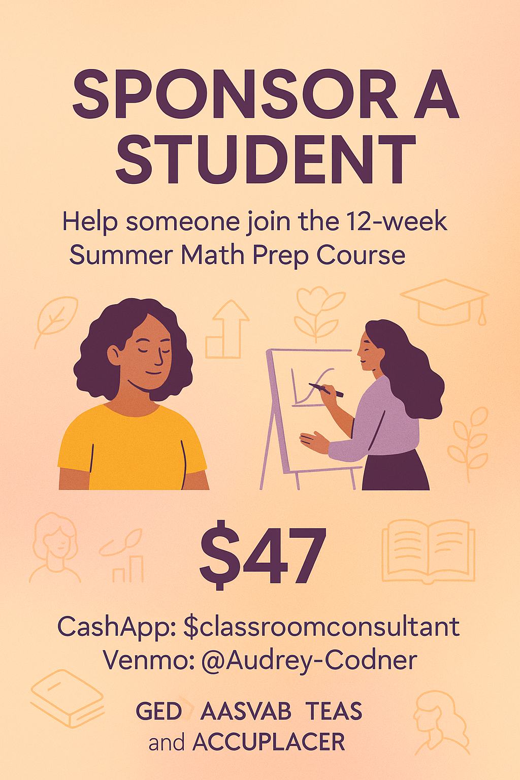 Help someone achieve their dreams by sponsoring a student in my 12-week Summer Math Prep Course.