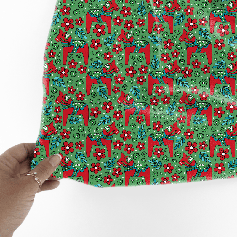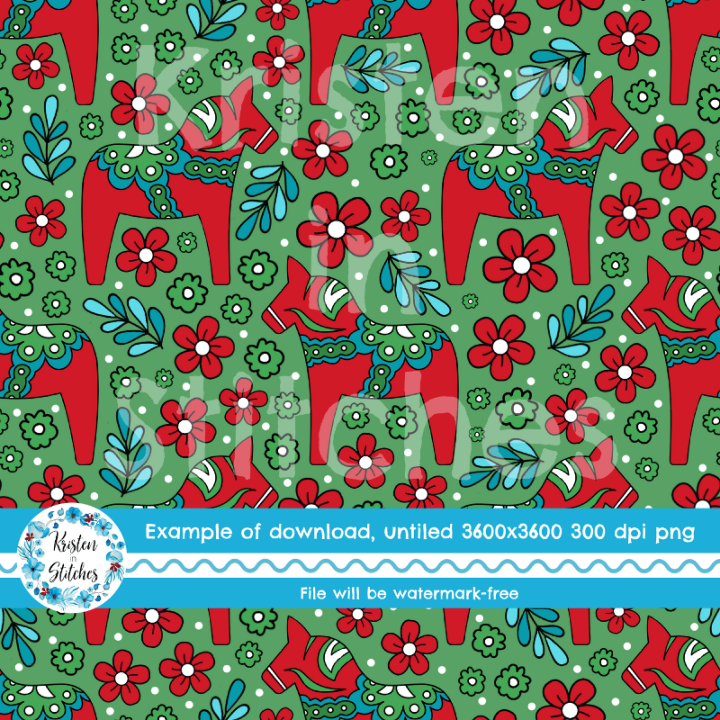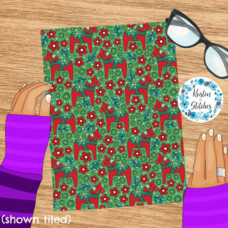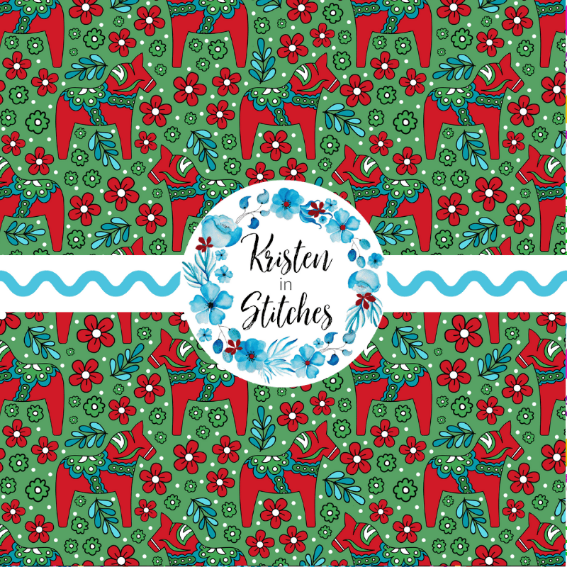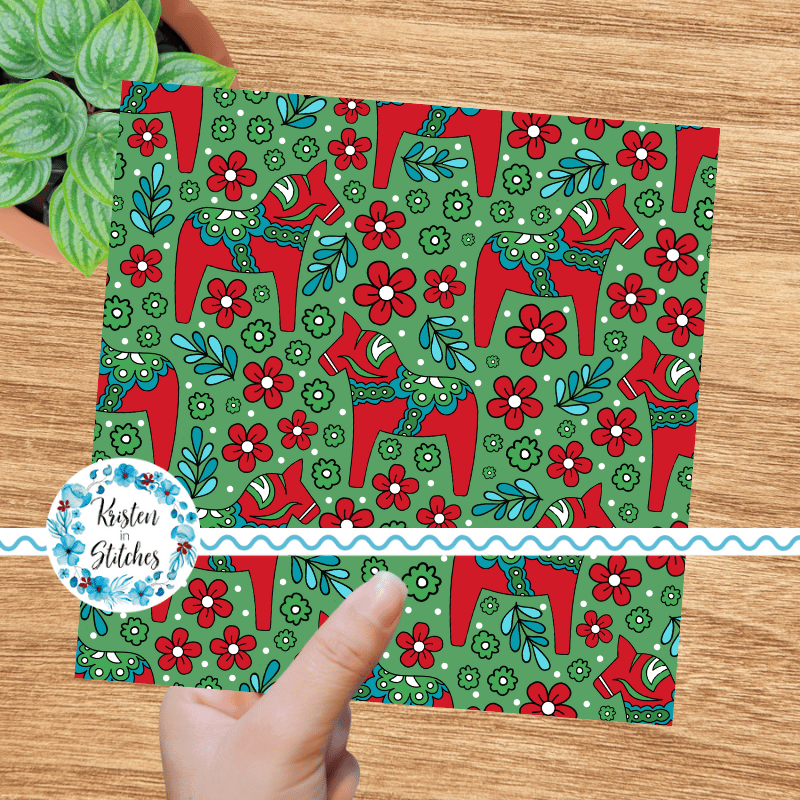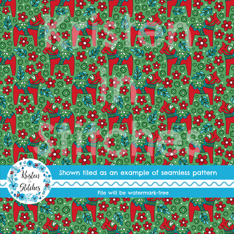 Dala Horse Scandinavian Folk Art Floral Seamless Pattern in Red and Green
