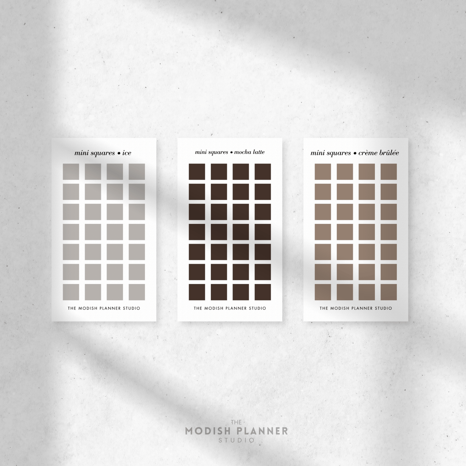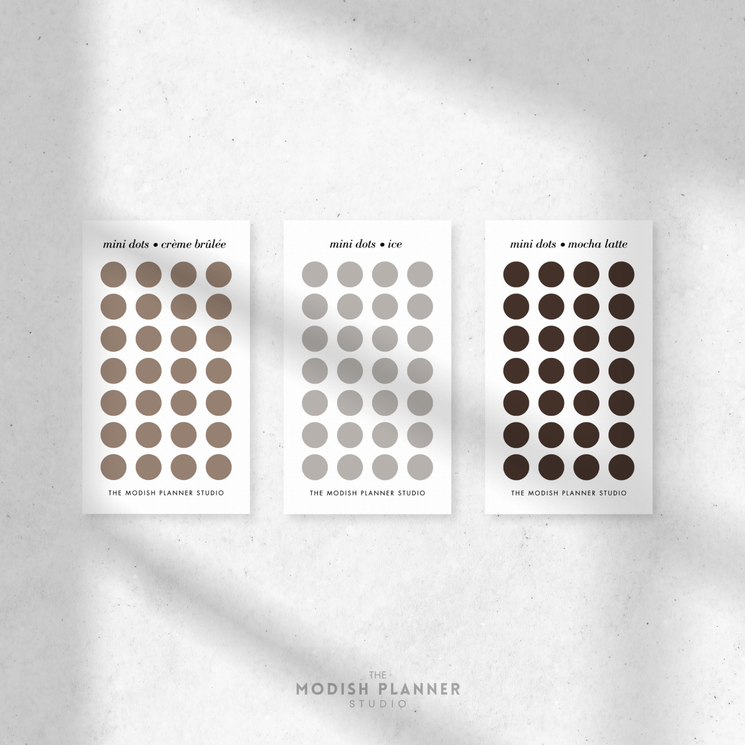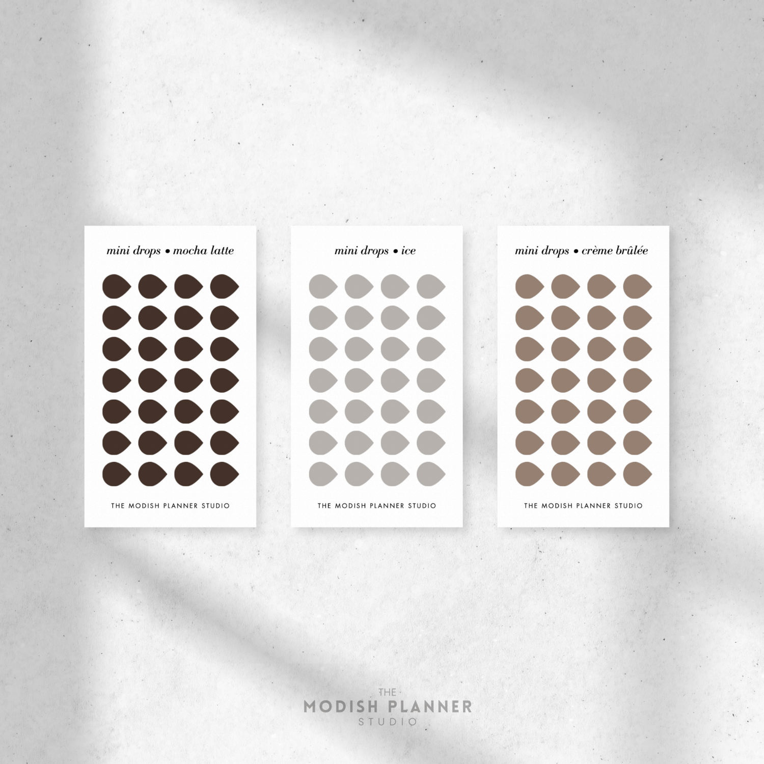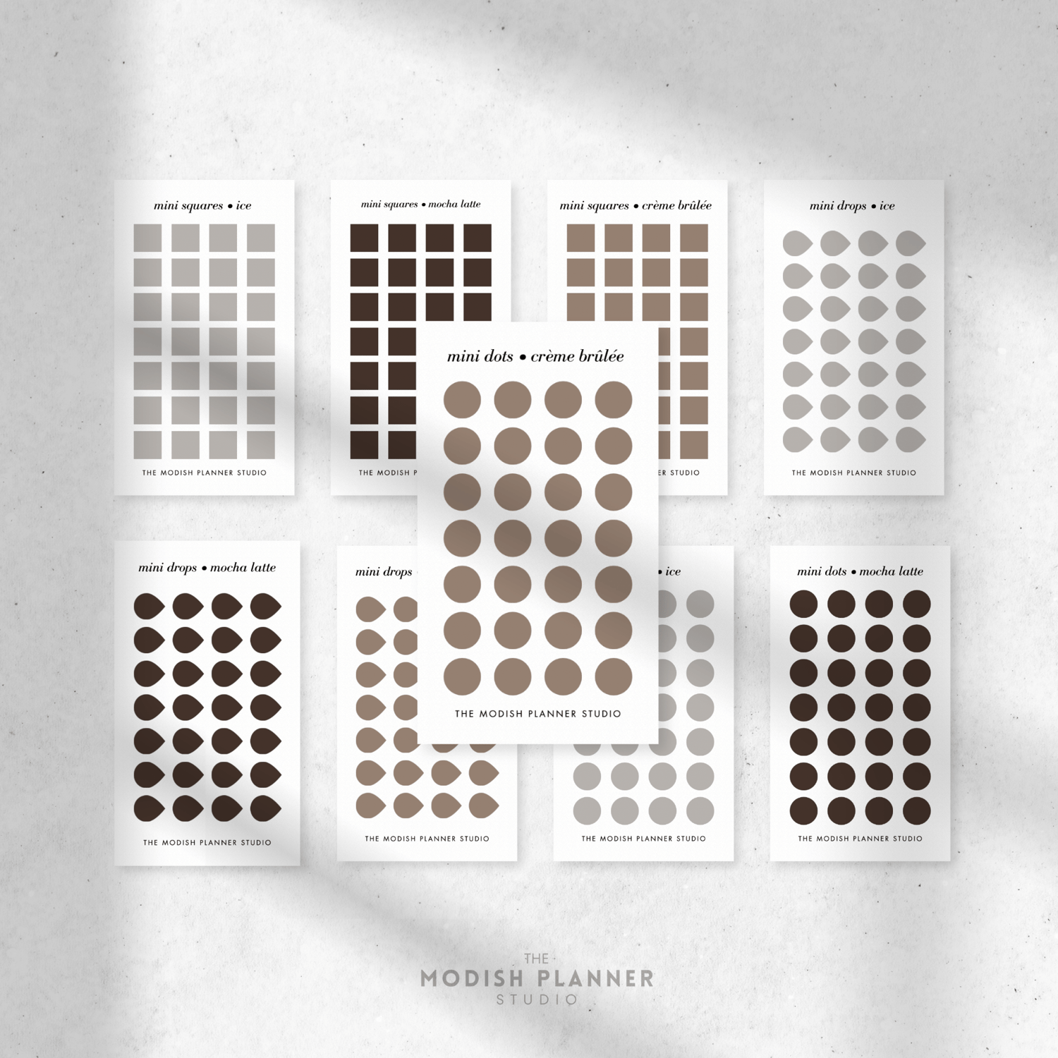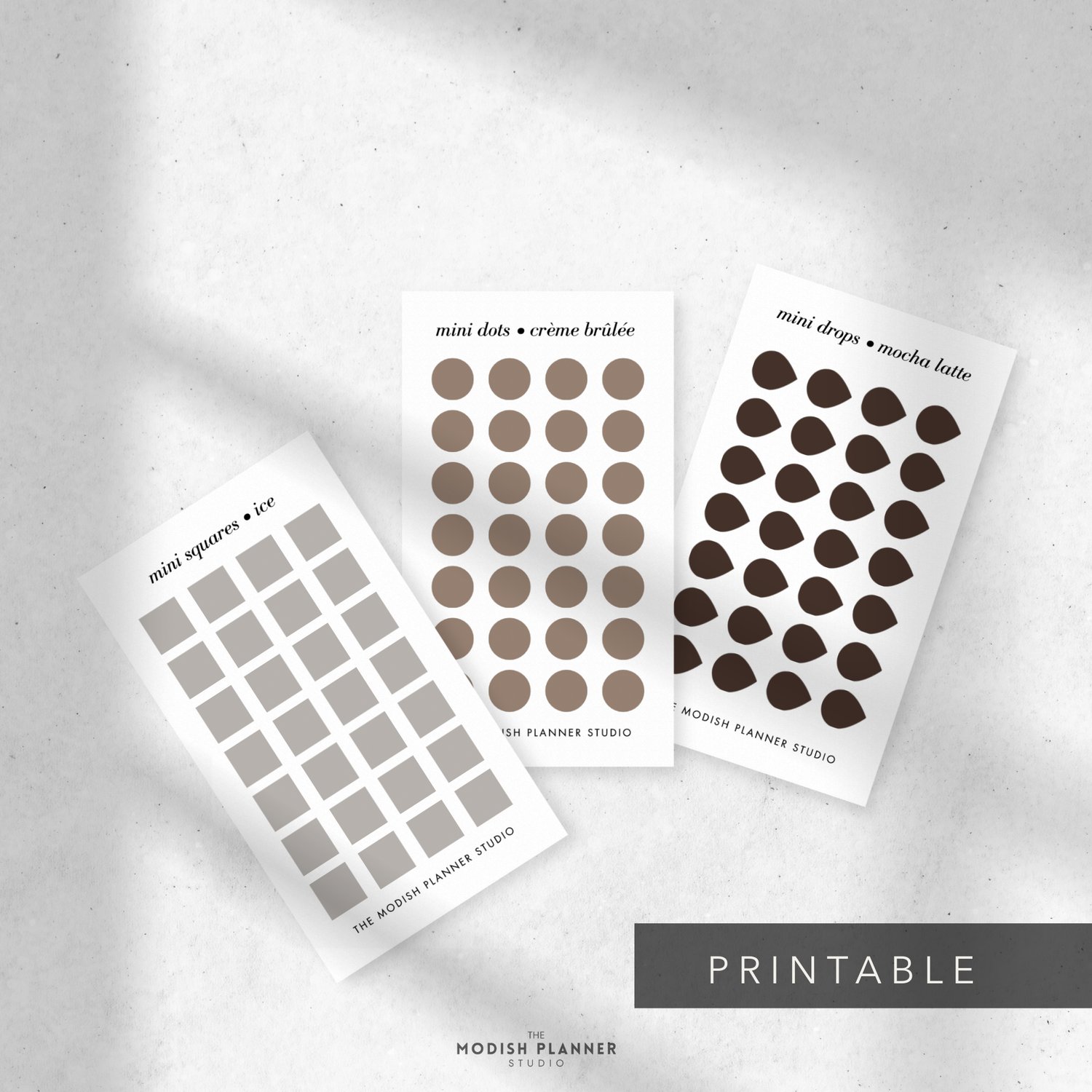 This set includes 9 mini sheet files in both PNG and SVG in three calming, versatile shades: Crème Brûlée, Mocha Latte, and Ice. Each sheet holds 28 stickers in one of three functional shapes—dots, squares, and drops—ideal for marking important dates, color coding, or adding a subtle pop to your spreads.