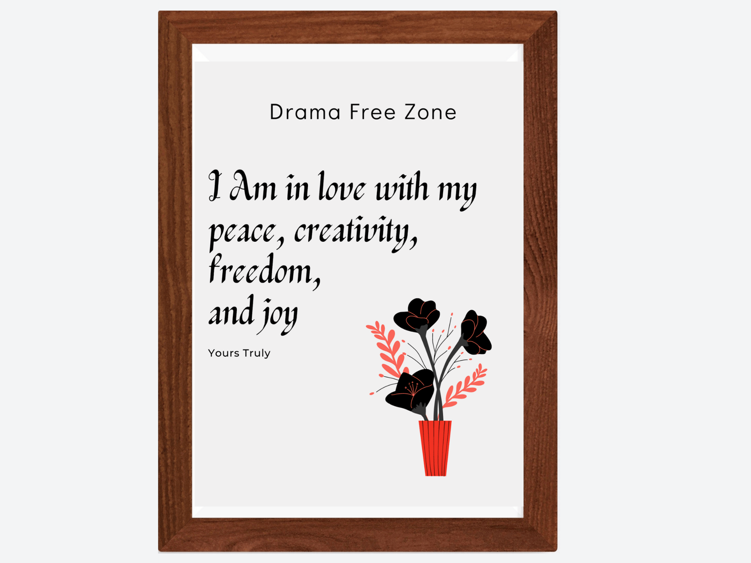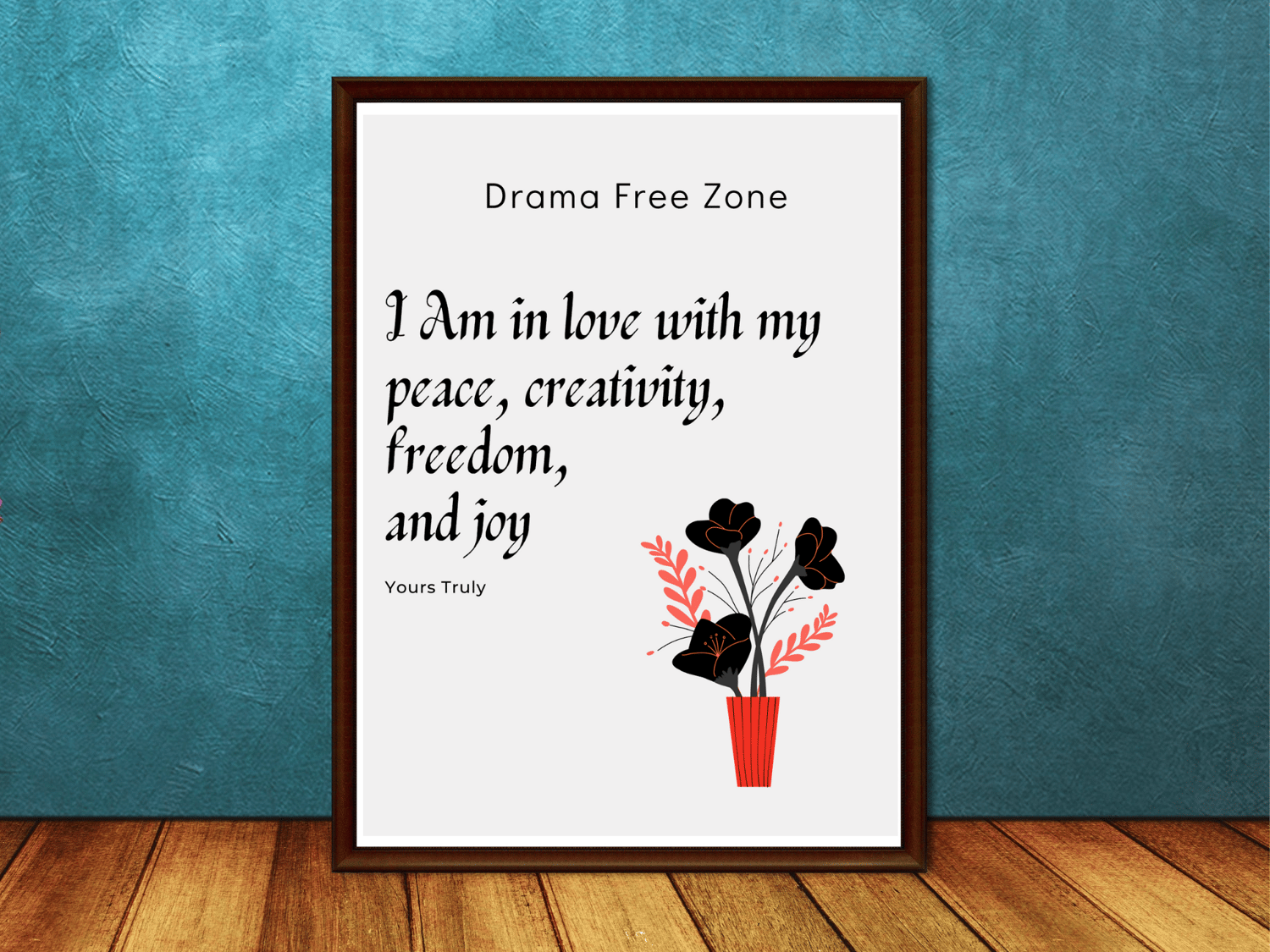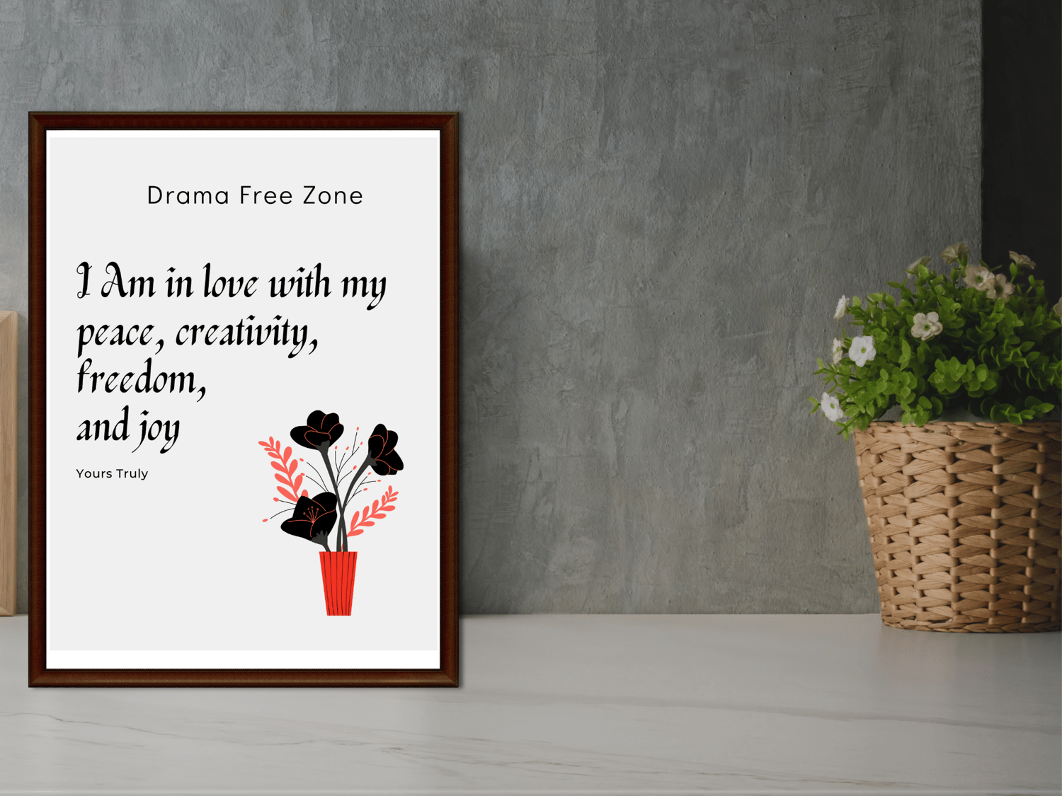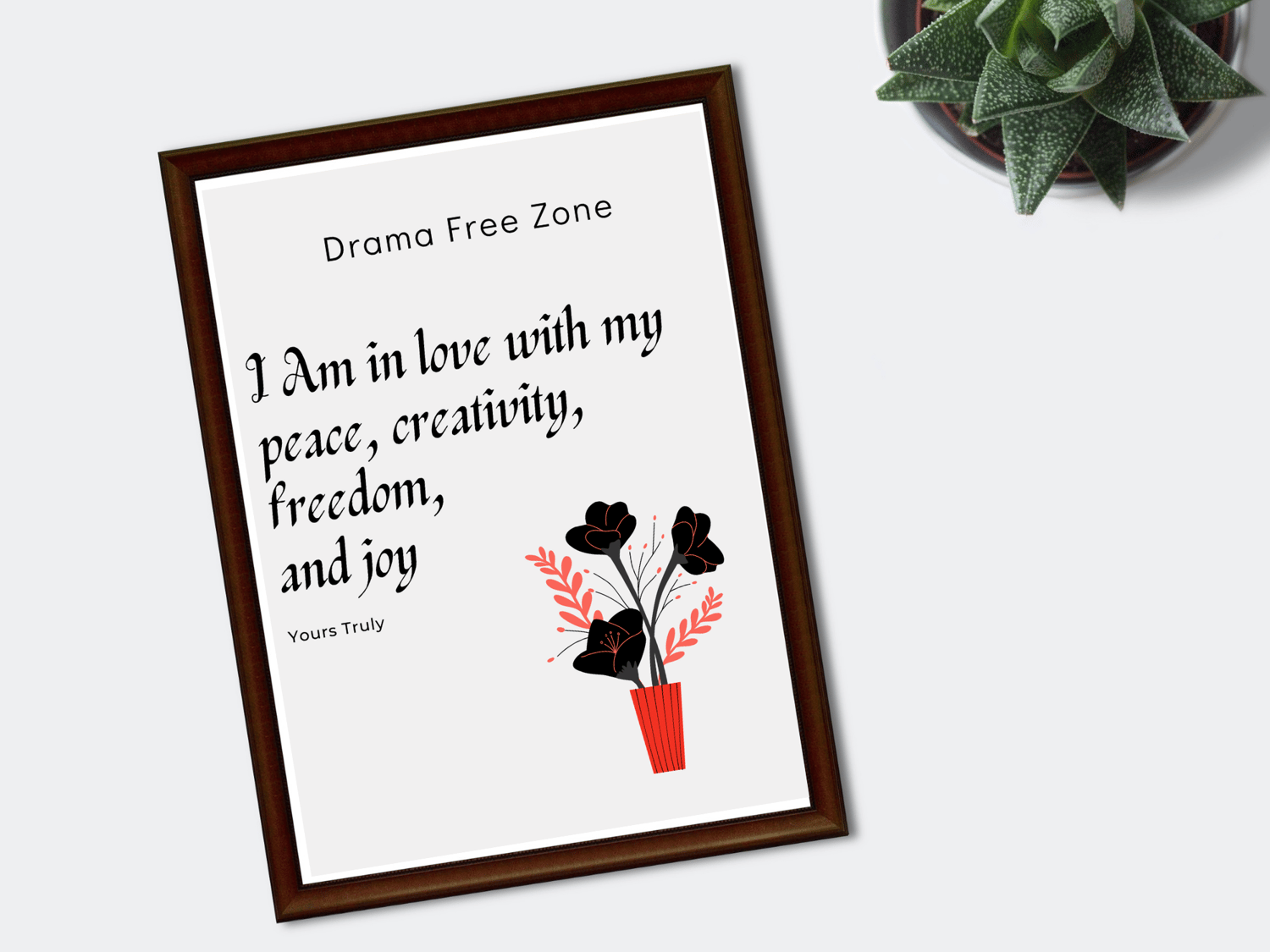 This 'Drama Free Zone' motivational poster print by Inspiring digitals in stylish lettering with beautiful black flowers and red leaves is designed to transform, inspire, and uplift. This powerful affirmation when spoken quietly or aloud manifests a drama-free zone and reminds you to stay in touch with your ultimate peace, creativity, freedom, and joy. Whenever you lose touch with your personal power this inspirational affirmative poster will gently bring you back to the center. The spoken word is like a wand and when used correctly never ceases to inspire changes from the inside out. It would make a terrific birthday gift for friends and family, or indeed any person who may be venturing into the magical world of affirmations for the first time. It would also make a great gift for yourself. This digital art print will look great in your Living Room, Office, Bedroom, Kitchen, Bathroom, or wherever you want a reminder of how powerful the spoken word can be. Since it comes in 4 sizes, it's very versatile. And since it's a digital download, it's the most affordable way to decorate!