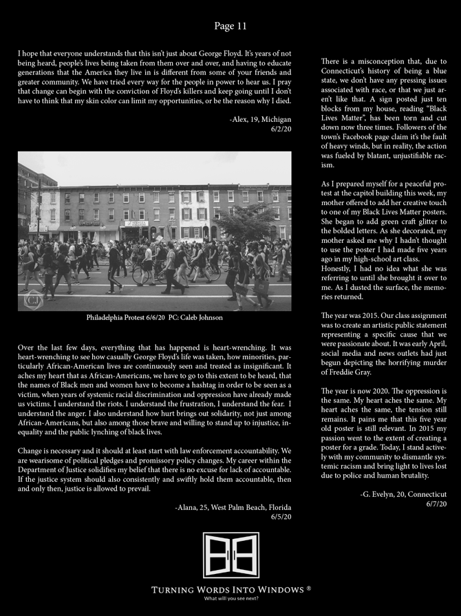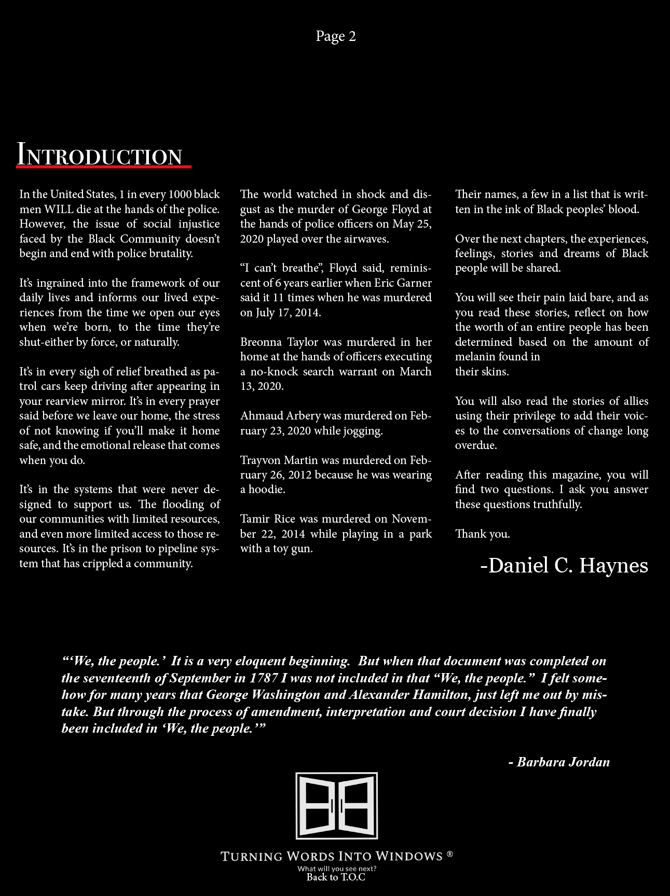 This is the inaugural edition of Turning Words Into Windows®, a digital magazine focused on feature stories, founded by Daniel C. Haynes. In this edition titled "US": A Collection of Our Stories, Thoughts and Dreams, the issues of social injustice, and police brutality faced by the Black Community is explored. Turn the page, you never know what you'll see next...