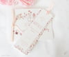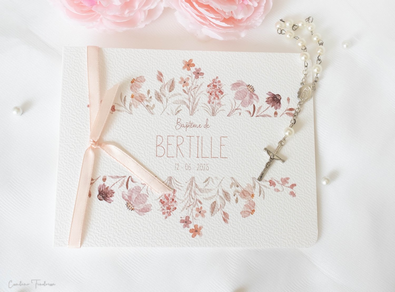 Dans la collection : Signets souvenir, faire-parts et enveloppes coordonnés, marque places, étiquettes pour dragées et menus.