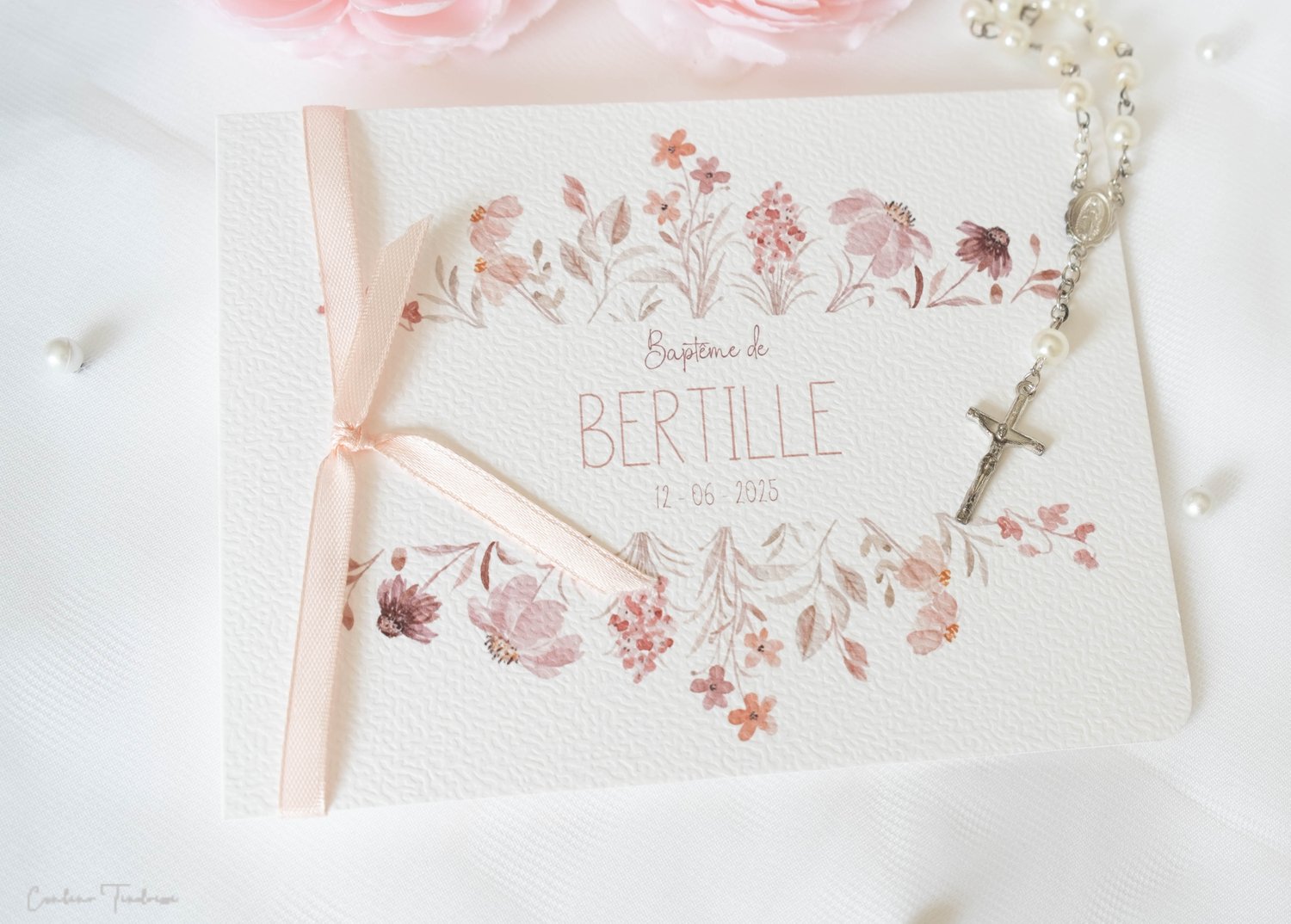 Le volet supérieur de ce faire-part s'orne de jolies fleurs des champs, qui encadrent élégamment le prénom de l'enfant.