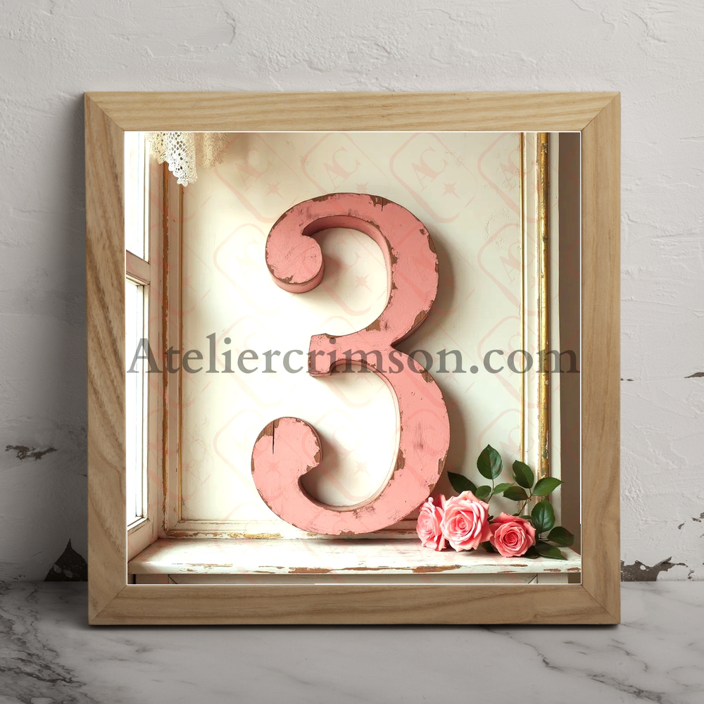 Number 3 pink and shabby chic This charming series presents the alphabet reimagined in a delightful shabby chic style. Each letter is crafted from weathered pink wood, standing proudly against a soft cream background. The collection exudes a romantic, vintage atmosphere with its elegant typography and subtle decorative elements.