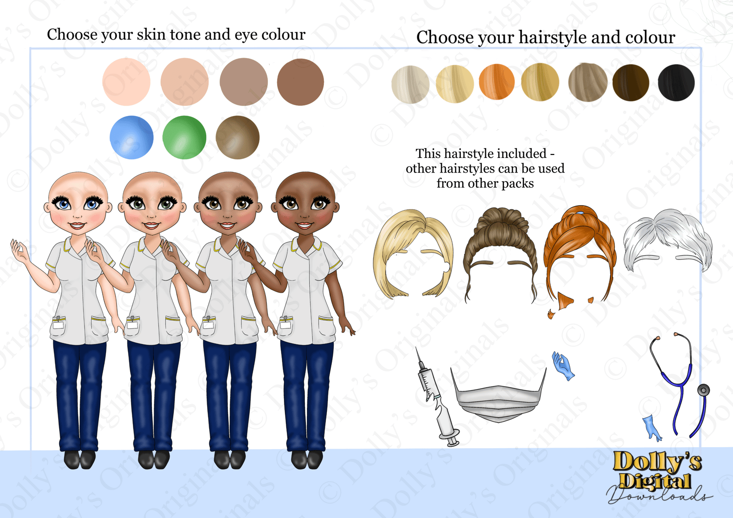 Instant digital download of our Nurse in White and Yellow with Navy Trousers PNG (76 PNG’s)