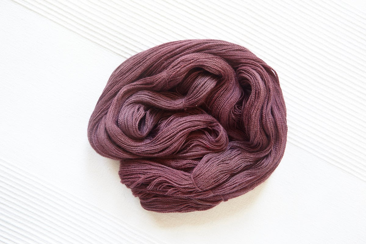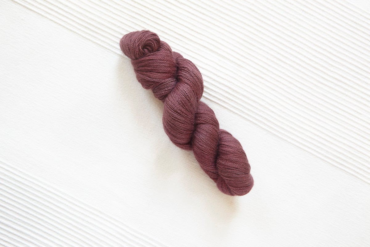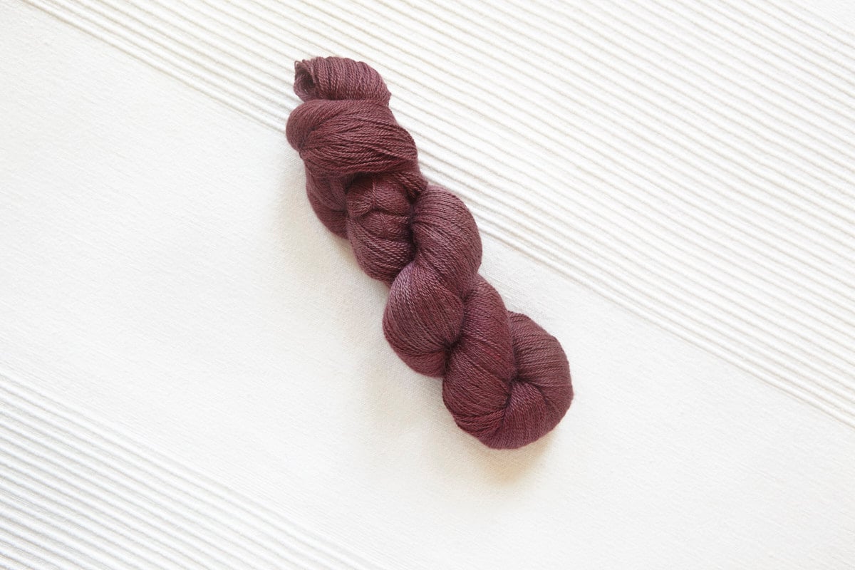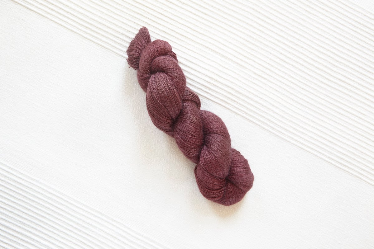 Whisper (Lace) in colorway: Rosy Grapes. Tonal variegated. Medium-dark muted burgundy with rosy undertones, almost semi-solid