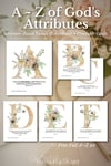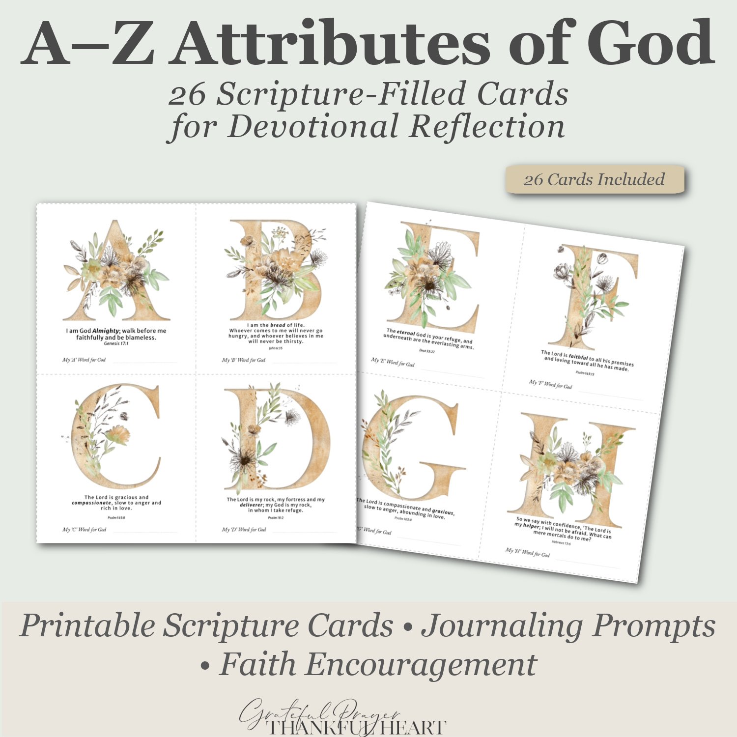 A–Z Attributes of God Scripture Card Set includes 26 beautifully designed cards, each featuring: