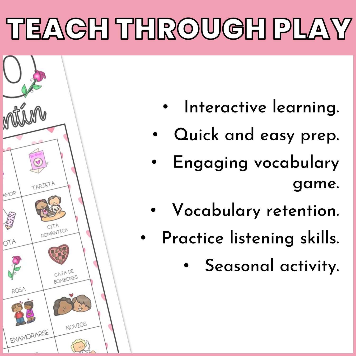 This "San Valentín" activity is the perfect way to practice 30 themed vocabulary words while keeping the classroom energy fun and focused.