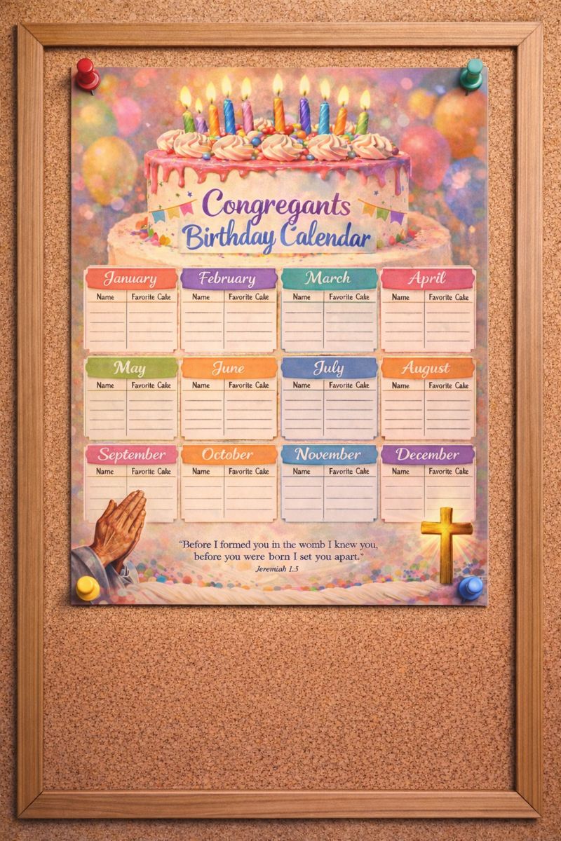 Celebrate and honor your church family with this beautifully designed Congregants Birthday Calendar, created especially for church bulletin boards, fellowship halls, and ministry spaces. This faith-inspired printable makes it easy to recognize birthdays throughout the year while adding a warm, welcoming touch to your church environment.