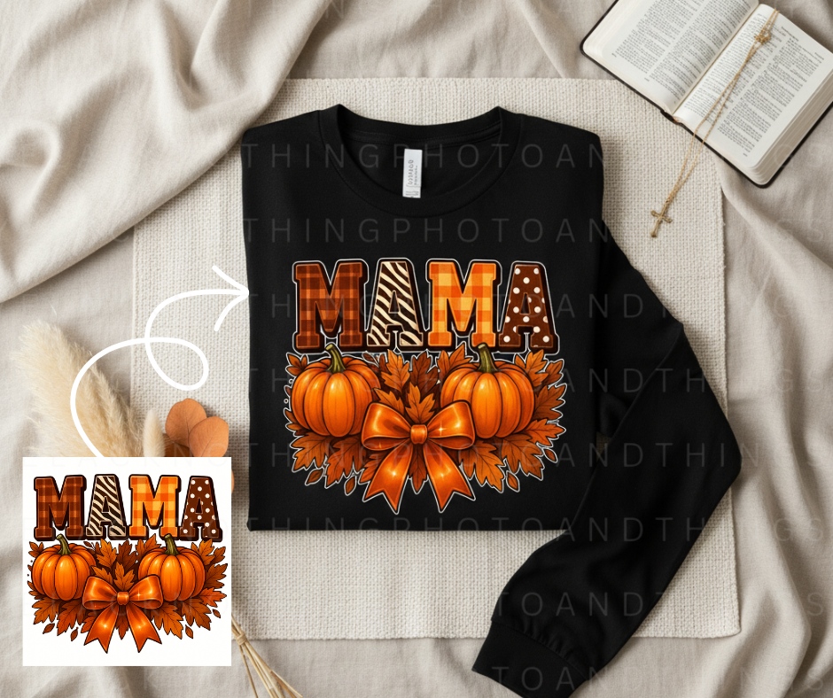 Embrace the cozy spirit of fall with our charming Pumpkin Harvest Design!** This high-quality digital PNG file features the word in a stylish, mixed-pattern font (plaid, zebra, and polka dots) framed by vibrant orange pumpkins, detailed autumn leaves, and a beautiful bow. It's the perfect design for creating unique apparel and gifts for the amazing mother in your life.