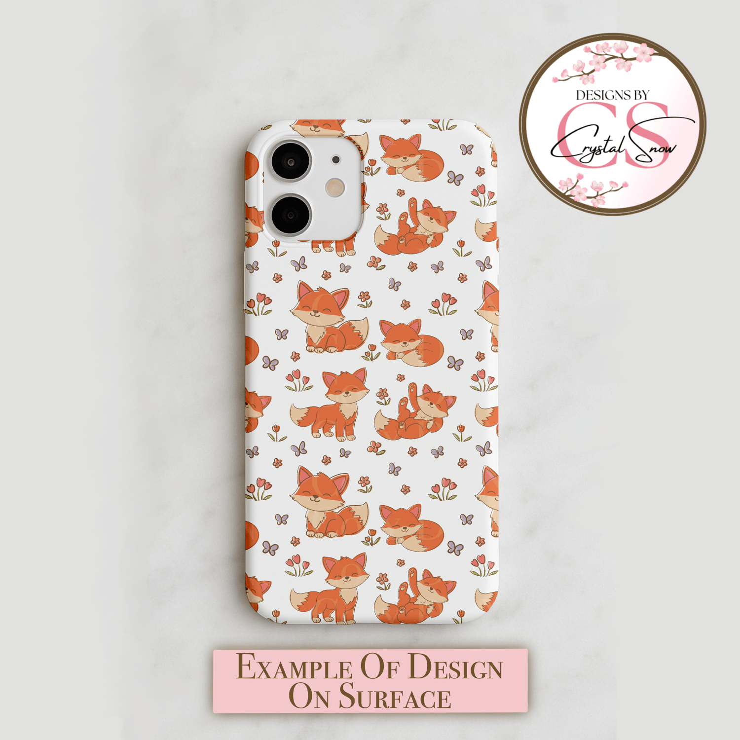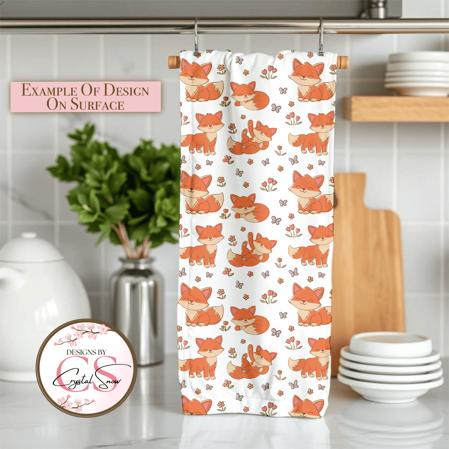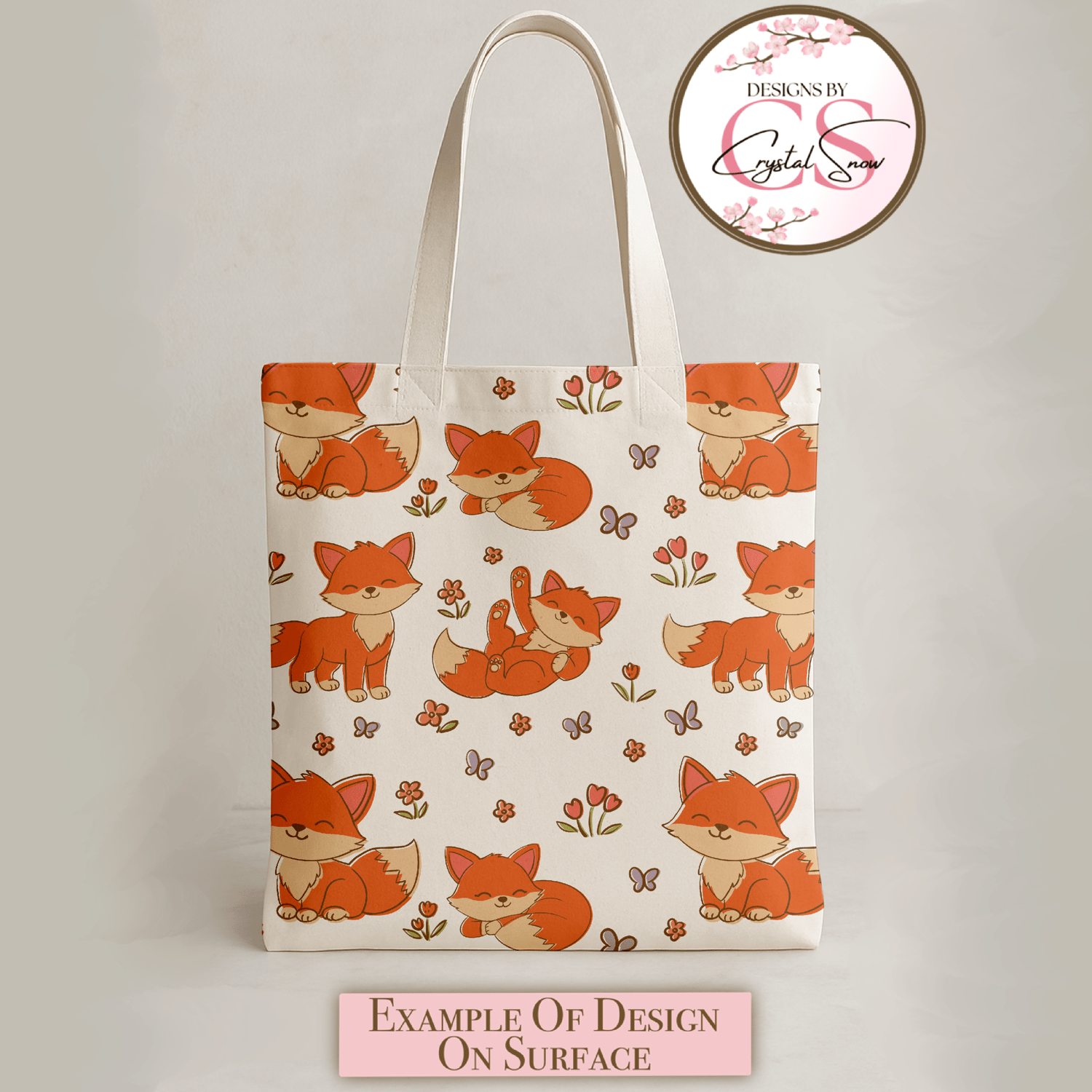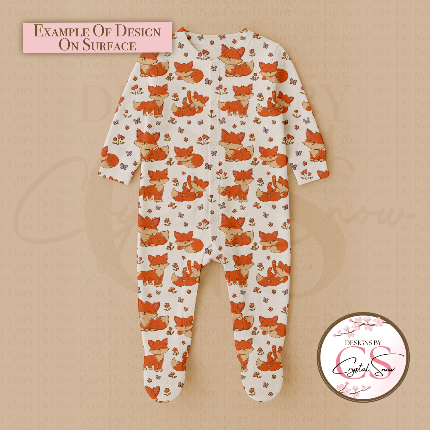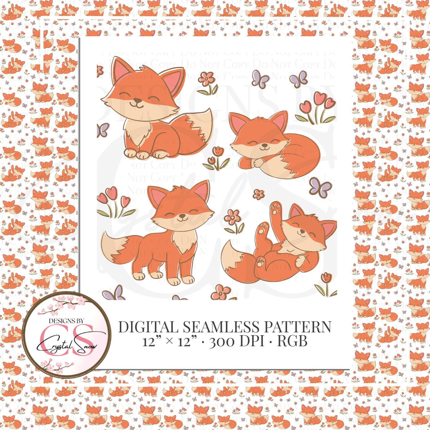 This seamless woodland fox pattern features adorable fox characters in playful poses surrounded by soft florals and butterflies. The gentle colors and storybook style make it perfect for baby, nursery, and children’s designs.
