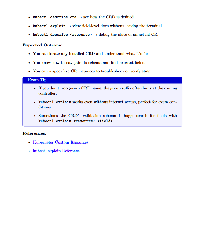- CRDs : inspect schemas, validate custom resources.