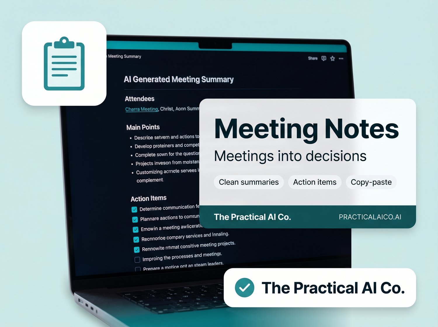 Copy/paste AI workflows to turn meetings into decisions and actions. Tool-agnostic: works with any AI chatbot. Clean corporate style with teal and blue accents, designed for clarity and efficiency.