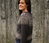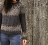 Primavera is the third design of my Einaudi Collection and is inspired by an Einaudi composition of the same name. The pattern of stranded colourwork around the yoke reflects the structure of the music: a simple melody that builds in complexity, with different elements combining and intertwining until they reach a climax of cascading scales. Following this climax the downward scales are mirrored by upward scales and in the same way on the garment the patterns of the yoke are mirrored in the patterns above the waistband. The use of intertwining shapes throughout also reflects the influence of traditional folk music that can be heard within the initial melody and accompanying harmonies.