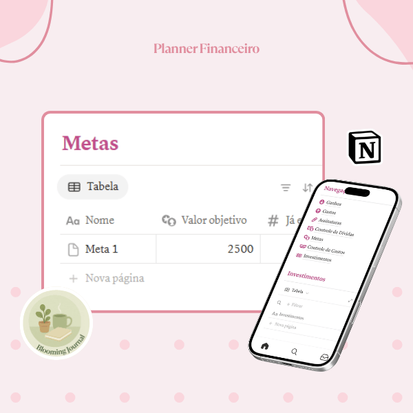 Este template reúne diferentes partes da sua vida financeira em um único espaço dentro do Notion, facilitando o acompanhamento de ganhos, gastos e metas no dia a dia!