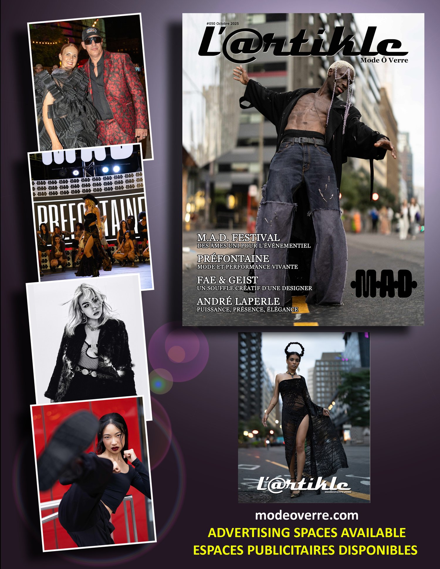 Dans cette édition, nous vous proposons une immersion au cœur de cette créativité vivante. Vous rencontrerez le duo visionnaire Chantal Durivage et Jean-François Daviau, véritables piliers du M.A.D. Festival, qui depuis vingt-cinq ans font rayonner Montréal à travers la mode. Vous vibrerez au rythme de la Maison Préfontaine, où l’art du vêtement prend vie dans une performance totale. Vous découvrirez aussi l’univers délicat et affirmé de Yuli Chouinard et de sa griffe Fae&Geist, célébration de la féminité audacieuse et de l’expression libre. Et surtout, vous serez transportés par les images puissantes de l’excellent photographe André Laperle, qui nous rappelle que chaque instant peut devenir œuvre d’art lorsqu’il est capté avec sensibilité et justesse.