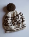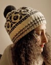 Gro is a very warm hat intended for the coldest days and nights of winter. It has a notch in the brim, worn in the back, making the hat comfortable and allowing it to fit different head sizes. Hat is worked flat for the ribbing, and then worked bottom up in the round. Pattern requires the following skills: working ribbing, knitting in the round on circular and/or double pointed needles, increasing, decreasing, stranded color work, making a pom pom (optional).